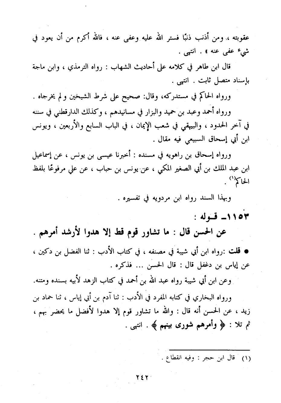 وَرَوَاهُ البُخَارِيّ فِي كِتَابه الْمُفْرد فِي الْأَدَب ثَنَا آدم بن أبي إِيَاس ثَنَا حَمَّاد بن زيد عَن الْحسن أَنه قَالَ وَالله مَا تشَاور قوم إِلَّا هُدُوا لأَفْضَل مَا يحضر بهم ثمَّ تَلا وَأمرهمْ شُورَى بَينهم انْتَهَى