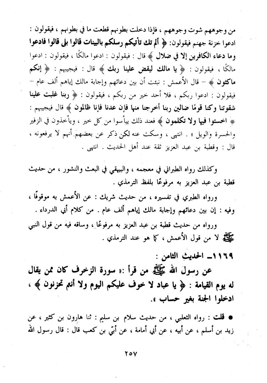 من وُجُوههم شَوَتْ وُجُوههم فَإِذا دخلت بطونهم قطعت مَا فِي بطونهم فَيَقُولُونَ ادعوا خَزَنَة جَهَنَّم فَيَقُولُونَ ألم تَكُ تَأْتيكُمْ رسلكُمْ بِالْبَيِّنَاتِ قَالُوا بلَى قَالُوا فَادعوا وَمَا دُعَاء الْكَافرين إِلَّا فِي ضلال قَالَ فَيَقُولُونَ ادعوا مَالِكًا فَيَقُولُونَ ادعوا مَالِكًا فَيَقُولُونَ يَا مَالك ليَقْضِ علينا رَبك قَالَ فَيُجِيبهُمْ إِنَّكُم مَاكِثُونَ قَالَ الْأَعْمَش نبئت أَن بَين دُعَائِهِمْ وَإجَابَة مَالك إيَّاهُم ألف عَام فَيَقُولُونَ ادعوا ربكُم فَلَا أحد خير من ربكُم فَيَقُولُونَ رَبنَا غلبت علينا شِقْوَتنَا وَكُنَّا قوما ضَالِّينَ رَبنَا أخرجنَا مِنْهَا فَإِن عدنا فَإنَّا ظَالِمُونَ قَالَ فَيُجِيبهُمْ اخْسَئُوا فِيهَا وَلَا تكَلمُون فَعِنْدَ ذَلِك يَيْأَسُوا من كل خير وَيَأْخُذُونَ فِي الزَّفِير وَالْحَسْرَة وَالْوَيْل) انْتَهَى وَسكت عَنهُ لَكِن ذكر عَن بَعضهم أَنهم لَا يَرْفَعُونَهُ قَالَ وَقُطْبَة بن عبد الْعَزِيز ثِقَة عِنْد أهل الحَدِيث انْتَهَى