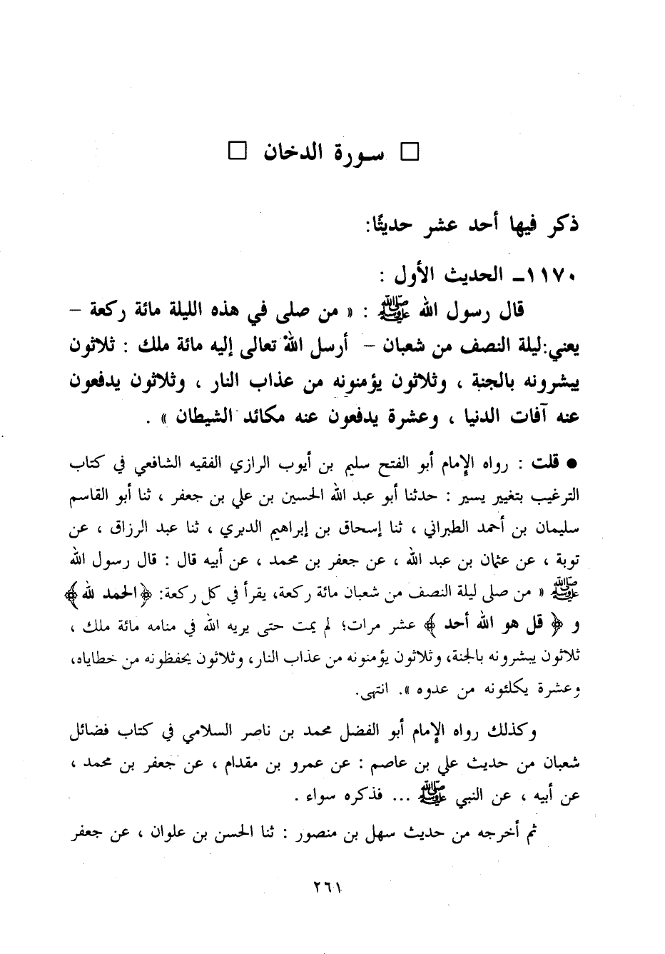 قلت رَوَاهُ الإِمَام أَبُو الْفَتْح سليم بن أَيُّوب الرَّازِيّ الْفَقِيه الشَّافِعِي فِي كتاب التَّرْغِيب بِتَغَيُّر يسير حَدثنَا أَبُو عبد الله الْحُسَيْن بن عَلّي بن جَعْفَر ثَنَا أَبُو الْقَاسِم سُلَيْمَان بن أَحْمد الطَّبَرَانِيّ ثَنَا إِسْحَاق بن إِبْرَاهِيم الدبرِي ثَنَا عبد الرازق عَن تَوْبَة عَن عُثْمَان بن عبد الله عَن جَعْفَر بن مُحَمَّد عَن أَبِيه قَالَ قَالَ رَسُول الله صَلَّى اللَّهُ عَلَيْهِ وَسَلَّم َ (من صَلَّى لَيْلَة النّصْف من شعْبَان مائَة رَكْعَة يقْرَأ فِي كل رَكْعَة الْحَمد لله وقل هُوَ الله أحد عشر مَرَّات لم يمت حَتَّى يرِيه الله فِي مَنَامه مائَة ملك ثَلَاثُونَ يُبَشِّرُونَهُ بِالْجنَّةِ وَثَلَاثُونَ يُؤَمِّنُونَهُ من عَذَاب النَّار وَثَلَاثُونَ يَحْفَظُونَهُ من خطاياه وَعشرَة يكلئونه من عدوه) انْتَهَى