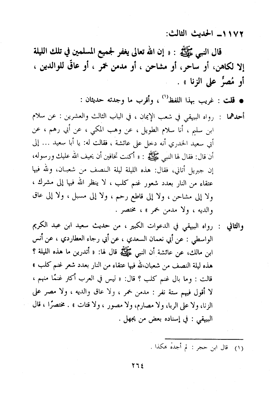 أَحدهمَا رَوَاهُ الْبَيْهَقِيّ فِي شعب الْإِيمَان فِي الْبَاب الثَّالِث وَالْعِشْرين عَن سَلام ابْن سليم أَنا سَلام الطَّوِيل عَن وهب الْمَكِّيّ عَن أبي رهم عَن أبي سعيد الْخُدْرِيّ أَنه دخل عَلَى عَائِشَة فَقَالَت لَهُ يَا أَبَا سعيد إِلَى أَن قَالَ فَقَالَ النَّبِي صَلَّى اللَّهُ عَلَيْهِ وَسَلَّم َ (أَكنت تَخَافِينَ أَن يَحِيف الله عَلَيْك وَرَسُوله إِن جِبْرِيل أَتَانِي فَقَالَ هَذِه اللَّيْلَة لَيْلَة النّصْف من شعْبَان وَللَّه فِيهَا عُتَقَاء من النَّار بِعَدَد شُعُور غنم كلب لَا ينظر الله فِيهَا إِلَى مُشْرك وَلَا إِلَى مُشَاحِن وَلَا إِلَى قَاطع رحم وَلَا إِلَى مُسبل وَلَا إِلَى عَاق وَالِديهِ وَلَا مدمن خمر) مُخْتَصر