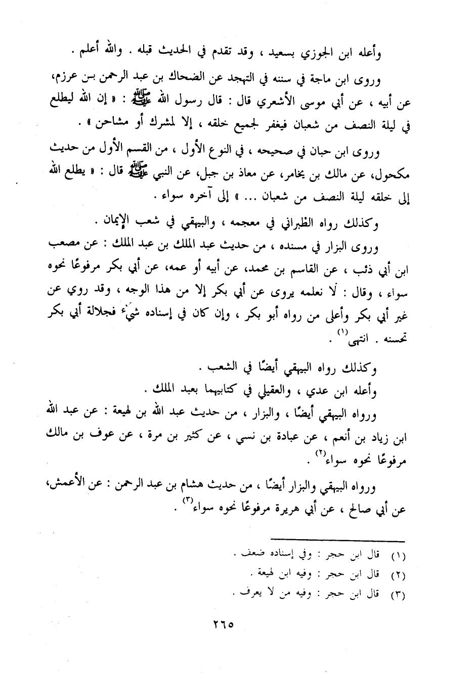 وَرَوَى ابْن ماجة فِي سنَنه فِي التَّهَجُّد عَن الضَّحَّاك بن عبد الرَّحْمَن بن عَرْزَم عَن أَبِيه عَن أبي مُوسَى الْأَشْعَرِيّ قَالَ قَالَ رَسُول الله صَلَّى اللَّهُ عَلَيْهِ وَسَلَّم َ (إِن الله ليطلع فِي لَيْلَة النّصْف من شعْبَان فَيغْفر لجَمِيع خلقه إِلَّا لِمُشْرِكٍ أَو مُشَاحِن)