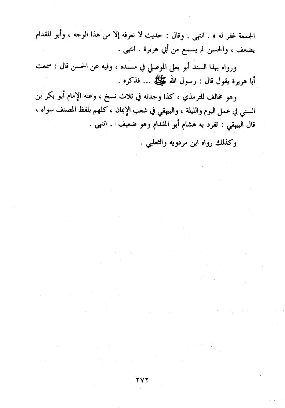 الْجُمُعَة غفر لَهُ) انْتَهَى وَقَالَ حَدِيث لَا نعرفه إِلَّا من هَذَا الْوَجْه وَأَبُو الْمِقْدَام يضعف وَالْحسن لم يسمع من أبي هُرَيْرَة انْتَهَى