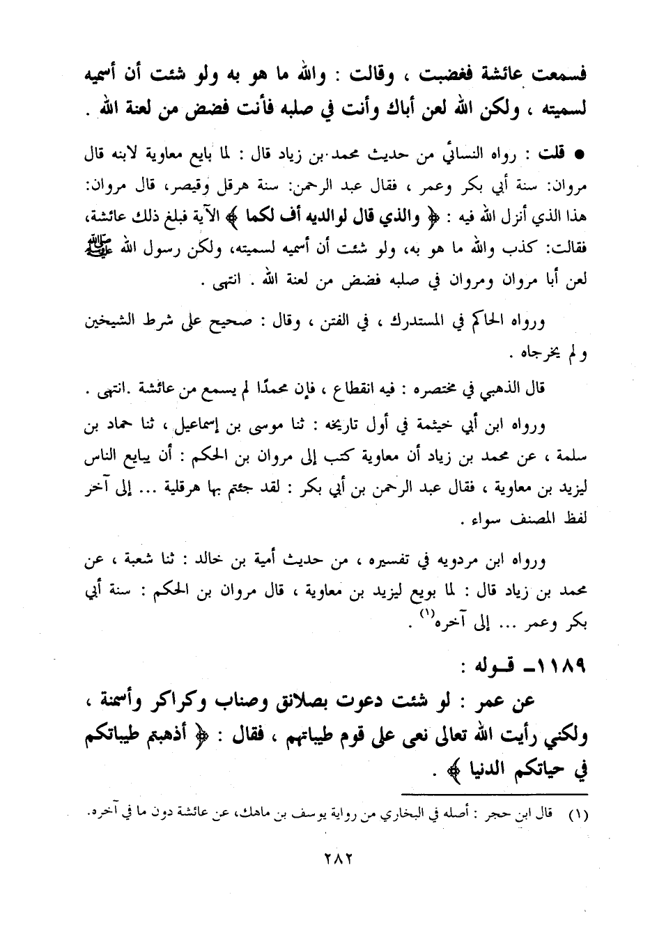 قلت رَوَاهُ النَّسَائِيّ من حَدِيث مُحَمَّد بن زِيَاد قَالَ لما بَايع مُعَاوِيَة لِابْنِهِ قَالَ مَرْوَان سنة أبي بكر وَعمر فَقَالَ عبد الرَّحْمَن سنة هِرقل وَقَيْصَر قَالَ مَرْوَان هَذَا الَّذِي أنزل الله فِيهِ وَالَّذِي قَالَ لوَالِديهِ أُفٍّ لَكمَا الْآيَة فَبلغ ذَلِك عَائِشَة فَقَالَت كذب وَالله مَا هُوَ بِهِ وَلَو شِئْت أَن أُسَمِّيهِ لَسَمَّيْته وَلَكِن رَسُول الله صَلَّى اللَّهُ عَلَيْهِ وَسَلَّم َ لعن أَبَا مَرْوَان ومروان فِي صلبه فضَض من لَعنه الله انْتَهَى