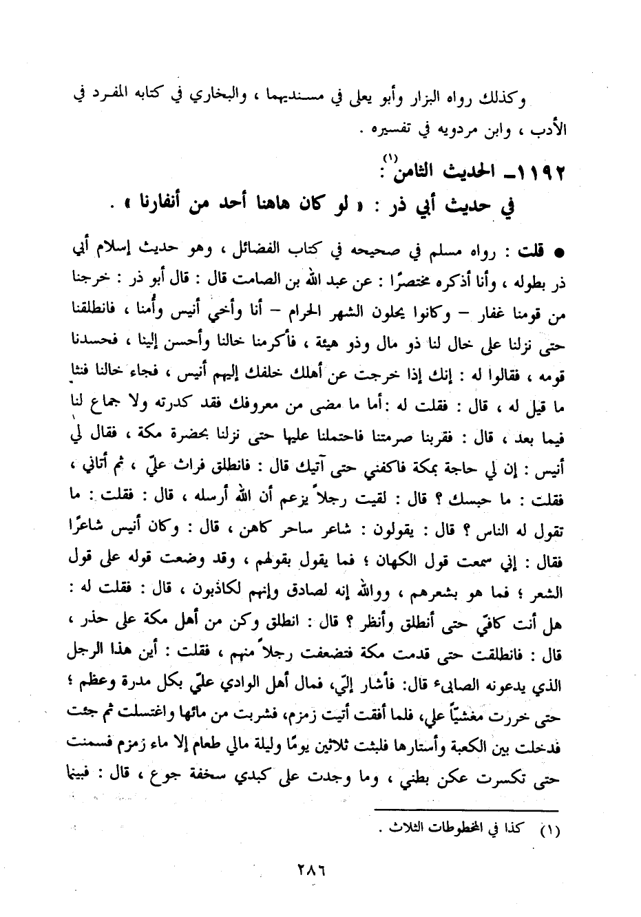 قلت رَوَاهُ مُسلم فِي صَحِيحه فِي كتاب الْفَضَائِل وَهُوَ حَدِيث إِسْلَام أبي ذَر بِطُولِهِ وَأَنا أذكرهُ مُخْتَصرا عَن عبد الله بن الصَّامِت قَالَ قَالَ أَبُو ذَر خرجنَا من قَومنَا غفار وَكَانُوا وَكَانُوا يحلونَ الشَّهْر الْحَرَام أَنا وَأخي أنيس وَأمنا فَانْطَلَقْنَا حَتَّى نزلنَا عَلَى خَال لنا ذُو مَال وَذُو هَيْئَة فَأَكْرَمَنَا خَالنَا وَأحسن إِلَيْنَا فَحَسَدنَا قومه فَقَالُوا لَهُ إِنَّك إِذا خرجت عَن أهلك خَلفك إِلَيْهِم أنيس فجَاء خَالنَا فَنَثَا مَا قيل لَهُ قَالَ فَقلت لَهُ أما مَا مَضَى من مَعْرُوفك فقد كدرته وَلَا جماع لنا فِيمَا بعد قَالَ فَقَرَّبْنَا صِرْمَتنَا فَاحْتَمَلْنَا عَلَيْهَا حَتَّى نزلنَا بِحَضْرَة مَكَّة فَقَالَ لي أنيس إِن لي حَاجَة بِمَكَّة فَاكْفِنِي حَتَّى آتِيك قَالَ فَانْطَلق فَرَاثَ عَلّي ثمَّ أَتَانِي فَقلت مَا حَسبك قَالَ لقِيت رجلا يزْعم أَن الله أرْسلهُ قَالَ فَقلت مَا تَقول لَهُ النَّاس قَالَ يَقُولُونَ شَاعِر سَاحر كَاهِن قَالَ وَكَانَ أنيس شَاعِرًا فَقَالَ إِنِّي سَمِعت قَول الْكُهَّان فَمَا يَقُول بقَوْلهمْ وَقد وضعت قَوْله عَلَى قَول الشّعْر فَمَا هُوَ بِشَعْرِهِمْ وَوَاللَّه إِنَّه لصَادِق وَإِنَّهُم لَكَاذِبُونَ قَالَ فَقلت لَهُ هَل أَنْت كَافِي حَتَّى أَنطلق وَأنْظر قَالَ انْطلق وَكن من أهل مَكَّة عَلَى حذر قَالَ انْطَلَقت حَتَّى قدمت مَكَّة فَتَضَعَّفْت رجلا مِنْهُم فَقلت أَيْن هَذَا الرجل الَّذِي يَدعُونَهُ الصَّابِئ قَالَ فَأَشَارَ إِلَيّ فَمَال أهل الْوَادي عَلّي بِكُل مَدَرَة وَعظم حَتَّى خَرَرْت مغشيا عَلّي فَلَمَّا أَفَقْت أتيت زَمْزَم فَشَرِبت من مَائِهَا وَاغْتَسَلت ثمَّ جِئْت فَدخلت بَين الْكَعْبَة وَأَسْتَارهَا فَلَبثت ثَلَاثِينَ يَوْمًا وَلَيْلَة مَالِي طَعَام إِلَّا مَاء زَمْزَم فَسَمنت حَتَّى تَكَسَّرَتْ عُكَن بَطْني وَمَا وجدت عَلَى كَبِدِي سخْفَة جوع قَالَ فَبَيْنَمَا