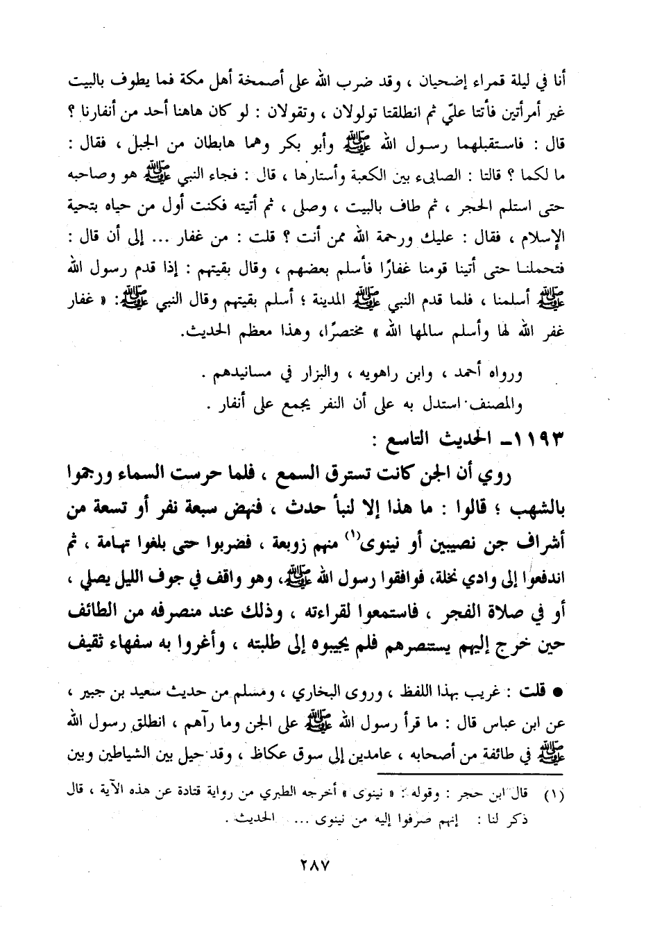 قلت غَرِيب بِهَذَا اللَّفْظ وَرَوَى البُخَارِيّ وَمُسلم من حَدِيث سعيد بن جُبَير عَن ابْن عَبَّاس قَالَ مَا قَرَأَ رَسُول الله صَلَّى اللَّهُ عَلَيْهِ وَسَلَّم َ عَلَى الْجِنّ وَمَا رَآهُمْ انْطلق رَسُول الله صَلَّى اللَّهُ عَلَيْهِ وَسَلَّم َ فِي طَائِفَة من أَصْحَابه عَامِدين إِلَى سوق عكاظ وَقد حيل بَين الشَّيَاطِين وَبَين
