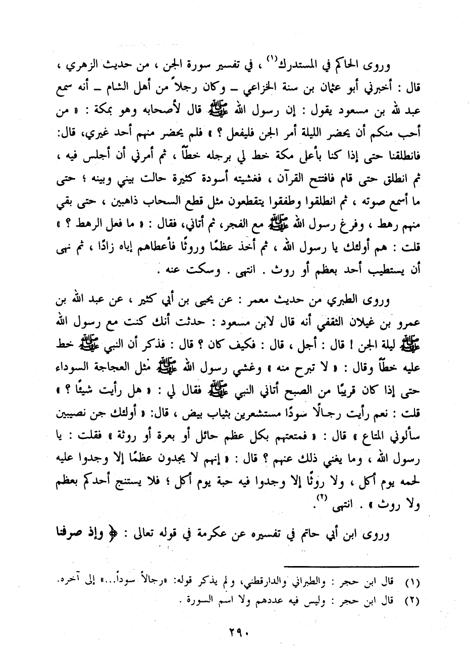 وَرَوَى الْحَاكِم فِي الْمُسْتَدْرك فِي تَفْسِير سُورَة الْجِنّ من حَدِيث الزُّهْرِيّ قَالَ أَخْبرنِي أَبُو عُثْمَان بن سنة الْخُزَاعِيّ وَكَانَ من أهل الشَّام أَنه سمع عبد الله بن مَسْعُود يَقُول إِن رَسُول الله صَلَّى اللَّهُ عَلَيْهِ وَسَلَّم َ قَالَ لأَصْحَابه وَهُوَ بِمَكَّة (من أحب مِنْكُم أَن يحضر اللَّيْلَة أَمر الْجِنّ فَلْيفْعَل) فَلم يحضر مِنْهُم أحد غَيْرِي قَالَ فَانْطَلَقْنَا حَتَّى إِذا كُنَّا بِأَعْلَى مَكَّة خطّ لي بِرجلِهِ خطا ثمَّ أَمرنِي أَن أَجْلِس فِيهِ ثمَّ انْطلق حَتَّى قَامَ فَافْتتحَ الْقُرْآن فَغَشِيتهُ أَسْوِدَة كَثِيرَة حَالَتْ بيني وَبَينه حَتَّى مَا أسمع صَوته ثمَّ انْطَلقُوا وَطَفِقُوا يَتَقَطَّعُون مثل قطع السَّحَاب ذَاهِبين حَتَّى بَقِي مِنْهُم رَهْط وَفرغ رَسُول الله صَلَّى اللَّهُ عَلَيْهِ وَسَلَّم َ مَعَ الْفجْر ثمَّ أَتَانِي فَقَالَ (مَا فعل الرَّهْط) قلت هم أُولَئِكَ يَا رَسُول الله ثمَّ أَخذ عظما وَرَوْثًا فَأَعْطَاهُمْ إِيَّاه زادا ثمَّ نهَى أَن يَسْتَطِيب أحد بِعظم أَو رَوْث انْتَهَى وَسكت عَنهُ