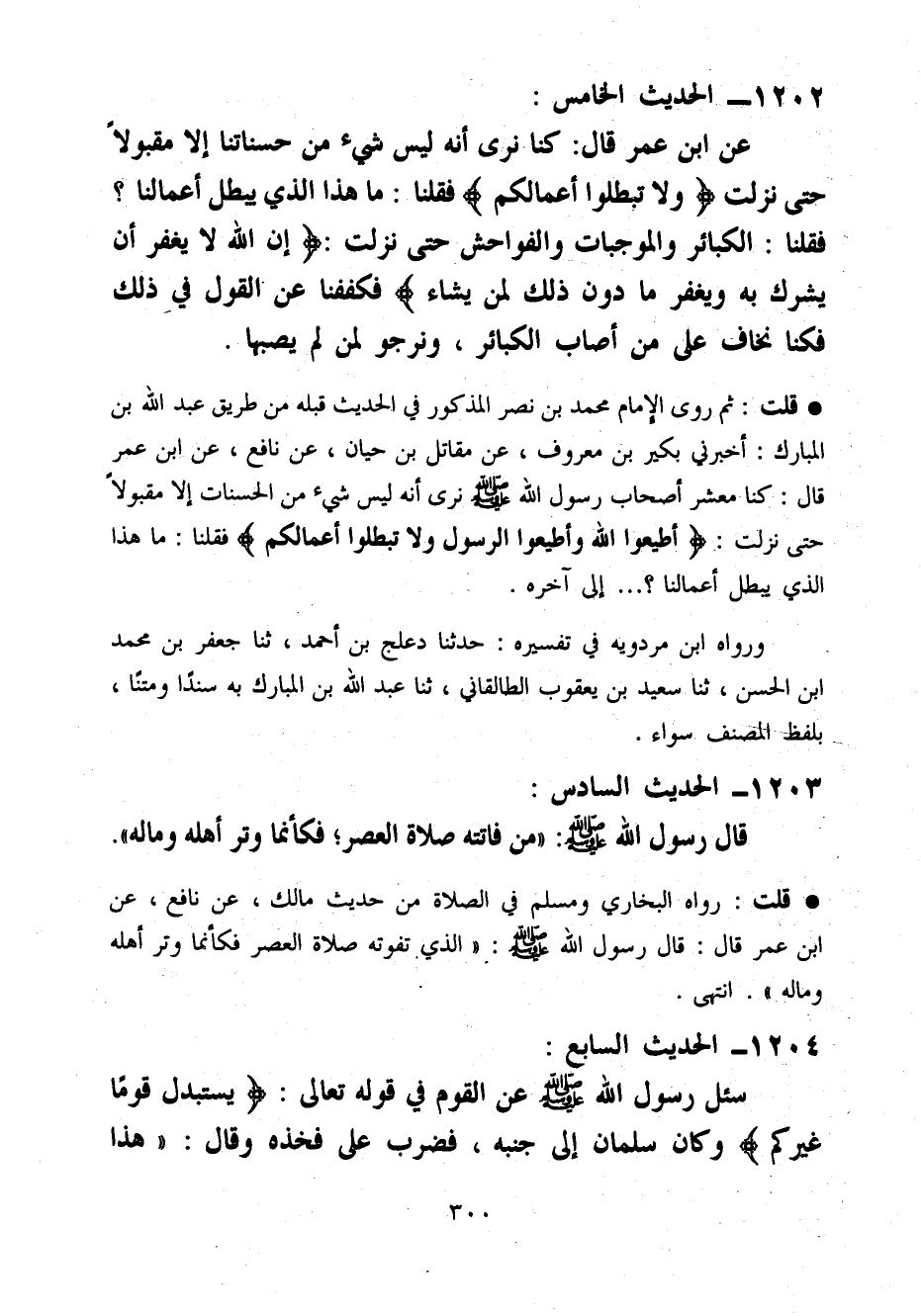 قلت ثمَّ رَوَى الإِمَام مُحَمَّد بن نصر الْمَذْكُور فِي الحَدِيث قبله من طَرِيق عبد الله بن الْمُبَارك أَخْبرنِي بكير بن مَعْرُوف عَن مقَاتل بن حَيَّان عَن نَافِع عَن ابْن عمر قَالَ كُنَّا معشر أَصْحَاب رَسُول الله صَلَّى اللَّهُ عَلَيْهِ وَسَلَّم َ نرَى أَنه لَيْسَ شَيْء من الْحَسَنَات إِلَّا مَقْبُولًا حَتَّى نزلت أطِيعُوا الله وَأَطيعُوا الرَّسُول وَلَا تُبْطِلُوا أَعمالكُم فَقُلْنَا مَا هَذَا الَّذِي يبطل أَعمالنَا ... إِلَى آخِره