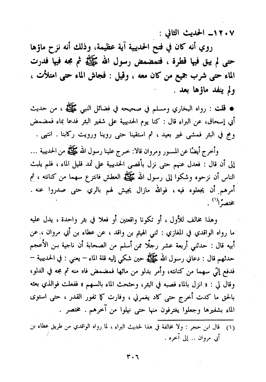 وَهَذَا مُخَالف للْأولِ أَو تَكُونَا وَاقِعَتَيْنِ أَو فعلا فِي بِئْر وَاحِدَة يدل عَلَيْهِ مَا رَوَاهُ الْوَاقِدِيّ فِي الْمَغَازِي ثني الْهَيْثَم بن وَاقد عَن عَطاء بن أبي مَرْوَان عَن أَبِيه قَالَ حَدثنِي أَرْبَعَة عشر رجلا مِمَّن أسلم من الصَّحَابَة أَن نَاجِية بن الْأَعْجَم حَدثهمْ قَالَ دَعَاني رَسُول الله صَلَّى اللَّهُ عَلَيْهِ وَسَلَّم َ حِين شكي إِلَيْهِ قلَّة المَاء يَعْنِي فِي الْحُدَيْبِيَة فَدفع إِلَيّ سَهْما من كِنَانَته وَأمر بِدَلْو من مَائِهَا فَمَضْمض فَاه مِنْهُ ثمَّ مجه فِي الدَّلْو وَقَالَ لي (انْزِلْ بِالْمَاءِ فَصَبَّهُ فِي الْبِئْر وحثحث المَاء بِالسَّهْمِ) فَفعلت فوالذي بَعثه بِالْحَقِّ مَا كدت أخرج حَتَّى كَاد يغمرني وَفَارَتْ كَمَا تَفُور الْقدر حَتَّى اسْتَوَى المَاء بشفيرها وَجعلُوا يَغْتَرِفُونَ مِنْهَا حَتَّى نَهِلُوا من آخِرهم مُخْتَصر