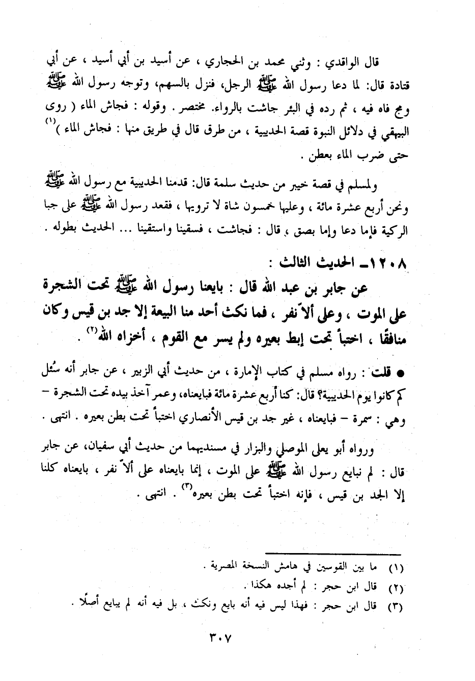 قلت رَوَاهُ مُسلم فِي كتاب الْإِمَارَة من حَدِيث أبي الزُّبَيْر عَن جَابر أَنه سُئِلَ كم كَانُوا يَوْم الْحُدَيْبِيَة قَالَ كُنَّا أَربع عشرَة مائَة فَبَايَعْنَاهُ وَعمر آخذ بِيَدِهِ تَحت الشَّجَرَة وَهِي سَمُرَة فَبَايَعْنَاهُ غير جد بن قيس الْأنْصَارِيّ اخْتَبَأَ تَحت بطن بعيره انْتَهَى