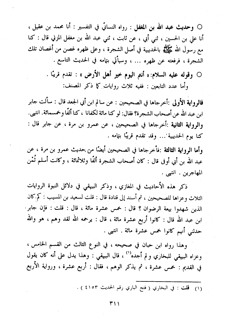 ذكر هَذِه الْأَحَادِيث فِي الْمَغَازِي وَذكر الْبَيْهَقِيّ فِي دَلَائِل النُّبُوَّة الرِّوَايَات الثَّلَاث وَعَزاهَا لِلصَّحِيحَيْنِ ثمَّ اسند إِلَى قَتَادَة قَالَ قلت لسَعِيد بن الْمسيب كم كَانَ الَّذين شهدُوا بيعَة الرضْوَان قَالَ خمس عشرَة مائَة قَالَ قلت فَإِن جَابر ابْن عبد الله قَالَ كَانُوا أَربع عشرَة مائَة قَالَ يرَحِمَهُ اللَّهُ لقد وهم هُوَ وَالله حَدثنِي أَنهم كَانُوا خمس عشرَة مائَة