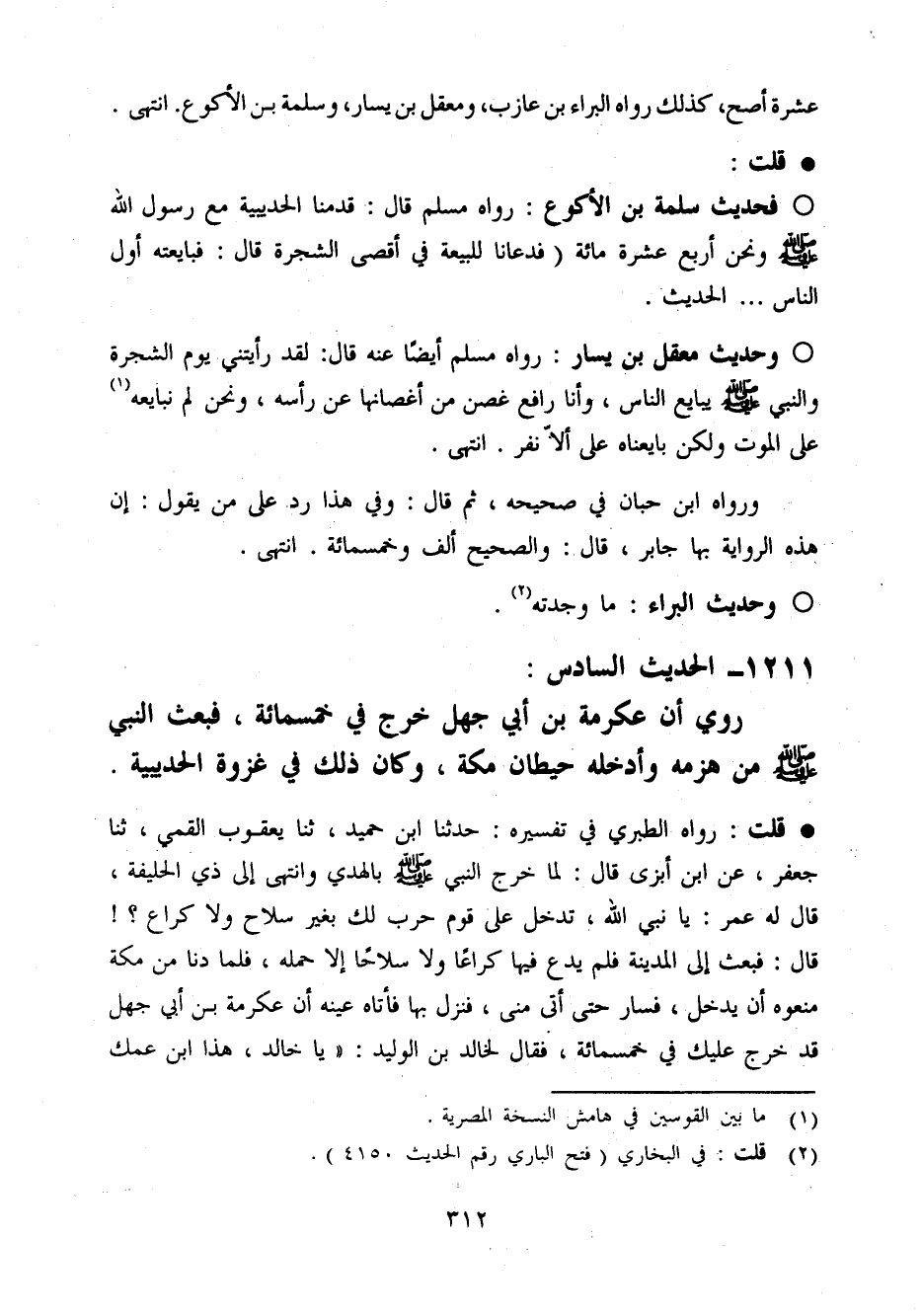 فَحَدِيث سَلمَة بن الْأَكْوَع رَوَاهُ مُسلم قَالَ قدمنَا الْحُدَيْبِيَة مَعَ رَسُول الله صَلَّى اللَّهُ عَلَيْهِ وَسَلَّم َ وَنحن أَربع عشرَة مائَة فَدَعَانَا لِلْبيعَةِ فِي أقْصَى الشَّجَرَة قَالَ فَبَايَعته أول النَّاس ... الحَدِيث