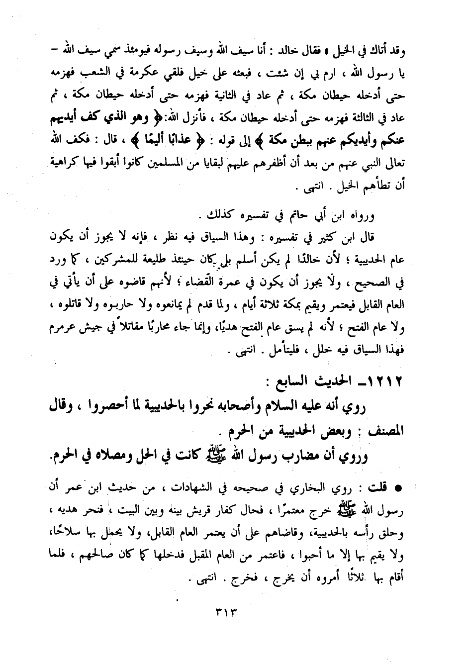 قلت رُوِيَ البُخَارِيّ فِي صَحِيحه فِي الشَّهَادَات من حَدِيث ابْن عمر أَن رَسُول الله صَلَّى اللَّهُ عَلَيْهِ وَسَلَّم َ خرج مُعْتَمِرًا فحال كفار قُرَيْش بَينه وَبَين الْبَيْت فَنحر هَدْيه وَحلق رَأسه بِالْحُدَيْبِية وَقَاضَاهُمْ عَلَى أَن يعْتَمر الْعَام الْقَابِل وَلَا يحمل بهَا سِلَاحا وَلَا يُقيم بهَا إِلَّا مَا أَحبُّوا فَاعْتَمَرَ من الْعَام الْمقبل فَدَخلَهَا كَمَا كَانَ صَالحهمْ فَلَمَّا أَقَامَ بهَا ثَلَاثًا أَمرُوهُ أَن يخرج فَخرج انْتَهَى