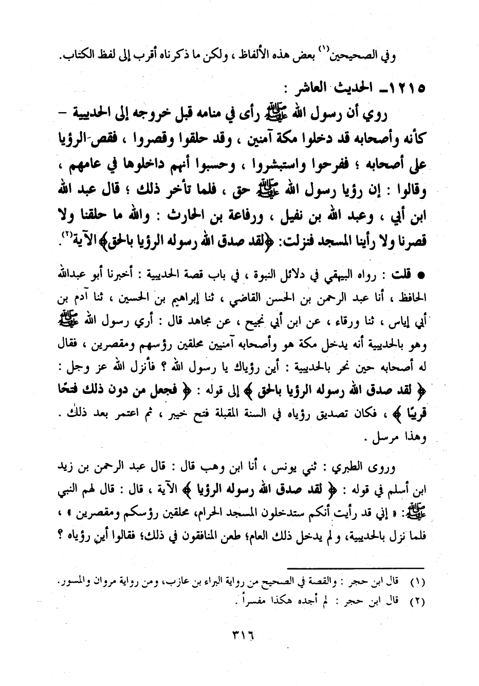 وَرَوَى الطَّبَرِيّ ثني يُونُس أَنا ابْن وهب قَالَ قَالَ عبد الرَّحْمَن بن زيد ابْن أسلم فِي قَوْله لقد صدق الله رَسُوله الرُّؤْيَا الْآيَة قَالَ قَالَ لَهُم النَّبِي صَلَّى اللَّهُ عَلَيْهِ وَسَلَّم َ (إِنِّي قد رَأَيْت أَنكُمْ سَتَدْخُلُونَ الْمَسْجِد الْحَرَام مُحَلِّقِينَ رءوسكم وَمُقَصِّرِينَ) فَلَمَّا نزل بِالْحُدَيْبِية وَلم يدْخل ذَلِك الْعَام طعن المُنَافِقُونَ فِي ذَلِك فَقَالُوا أَيْن رُؤْيَاهُ