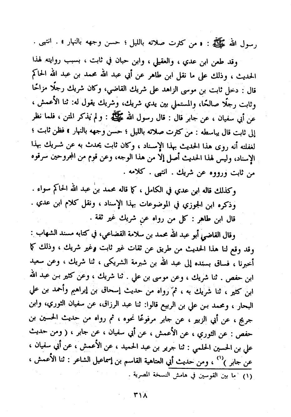وَقد طعن ابْن عدي والعقيلي وَابْن حبَان فِي ثَابت بِسَبَب رِوَايَته لهَذَا الحَدِيث وَذَلِكَ عَلَى مَا نقل ابْن طَاهِر عَن أبي عبد الله مُحَمَّد بن عبد الله الْحَاكِم قَالَ دخل ثَابت بن مُوسَى الزَّاهِد عَلَى شريك القَاضِي وَكَانَ شريك رجلا مزاحا وثابت رجلا صَالحا وَالْمُسْتَمْلِي بَين يَدي شريك وَشريك يَقُول لَهُ ثَنَا الْأَعْمَش عَن أبي سُفْيَان عَن جَابر قَالَ قَالَ رَسُول الله صَلَّى اللَّهُ عَلَيْهِ وَسَلَّم َ وَلم يذكر الْمَتْن فَلَمَّا نظر إِلَى ثَابت قَالَ يباسطه (من كثرت صلَاته بِاللَّيْلِ حسن وَجهه بِالنَّهَارِ) فَظن ثَابت لِغَفْلَتِه أَنه رَوَى هَذَا الحَدِيث بِهَذَا الْإِسْنَاد وَكَانَ ثَابت يحدث بِهِ عَن شريك بِهَذَا الْإِسْنَاد وَلَيْسَ لهَذَا الحَدِيث أصل إِلَّا من هَذَا الْوَجْه وَعَن قوم من الْمَجْرُوحين سَرقُوهُ من ثَابت وَرَوَوْهُ عَن شريك انْتَهَى كَلَامه