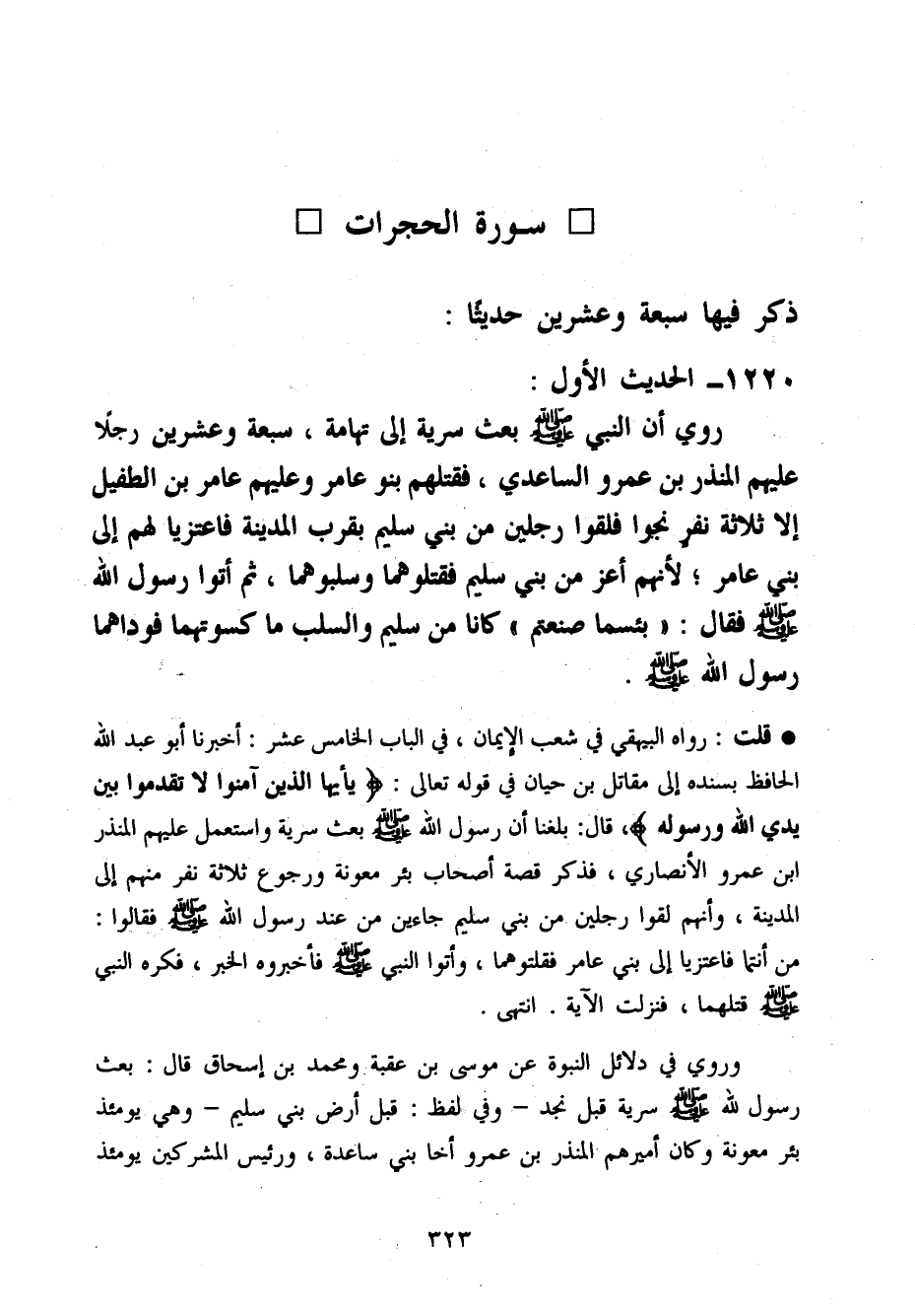 قلت رَوَاهُ الْبَيْهَقِيّ فِي شعب الْإِيمَان فِي الْبَاب الْخَامِس عشر أخبرنَا أَبُو عبد الله الْحَافِظ بِسَنَدِهِ إِلَى مقَاتل بن حَيَّان فِي قَوْله تَعَالَى يأيها الَّذين آمنُوا لَا تقدمُوا بَين يَدي الله وَرَسُوله قَالَ بلغنَا أَن رَسُول الله صَلَّى اللَّهُ عَلَيْهِ وَسَلَّم َ بعث سَرِيَّة وَاسْتعْمل عَلَيْهِم الْمُنْذر ابْن عَمْرو الْأنْصَارِيّ فَذكر قصَّة أَصْحَاب بِئْر مَعُونَة وَرُجُوع ثَلَاثَة نفر مِنْهُم إِلَى الْمَدِينَة وَأَنَّهُمْ لقوا رجلَيْنِ من بني سليم جاءين من عِنْد رَسُول الله صَلَّى اللَّهُ عَلَيْهِ وَسَلَّم َ فَقَالُوا من أَنْتُمَا فاعتزيا إِلَى بني عَامر فَقَتَلُوهُمَا وَأتوا النَّبِي صَلَّى اللَّهُ عَلَيْهِ وَسَلَّم َ فأخبروه الْخَبَر فكره النَّبِي صَلَّى اللَّهُ عَلَيْهِ وَسَلَّم َ قَتلهمَا فَنزلت الْآيَة انْتَهَى