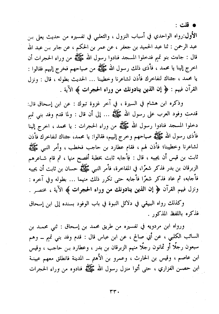 الأول رَوَاهُ الواحدي فِي أَسبَاب النُّزُول والثعلبي فِي تَفْسِيره من حَدِيث يعْلى بن عبد الرَّحْمَن ثَنَا عبد الحميد بن جَعْفَر عَن عمر بن الحكم عَن جَابر بن عبد الله قَالَ جَاءَت بَنو تَمِيم فَدَخَلُوا الْمَسْجِد فَنَادوا رَسُول الله صَلَّى اللَّهُ عَلَيْهِ وَسَلَّم َ من وَرَاء الحجرات أَن اخْرُج إِلَيْنَا يَا مُحَمَّد فَأَذَى ذَلِك رَسُول الله صَلَّى اللَّهُ عَلَيْهِ وَسَلَّم َ من صِيَاحهمْ فَخرج إِلَيْهِم فَقَالُوا يَا مُحَمَّد جئْنَاك لِنُفَاخِرَك فَأذن لِشَاعِرِنَا وَخَطِيبِنَا ... الحَدِيث بِطُولِهِ قَالَ وَنزل الْقُرْآن فيهم (إِن الَّذين يُنَادُونَك من وَرَاء الحجرات) الْآيَة