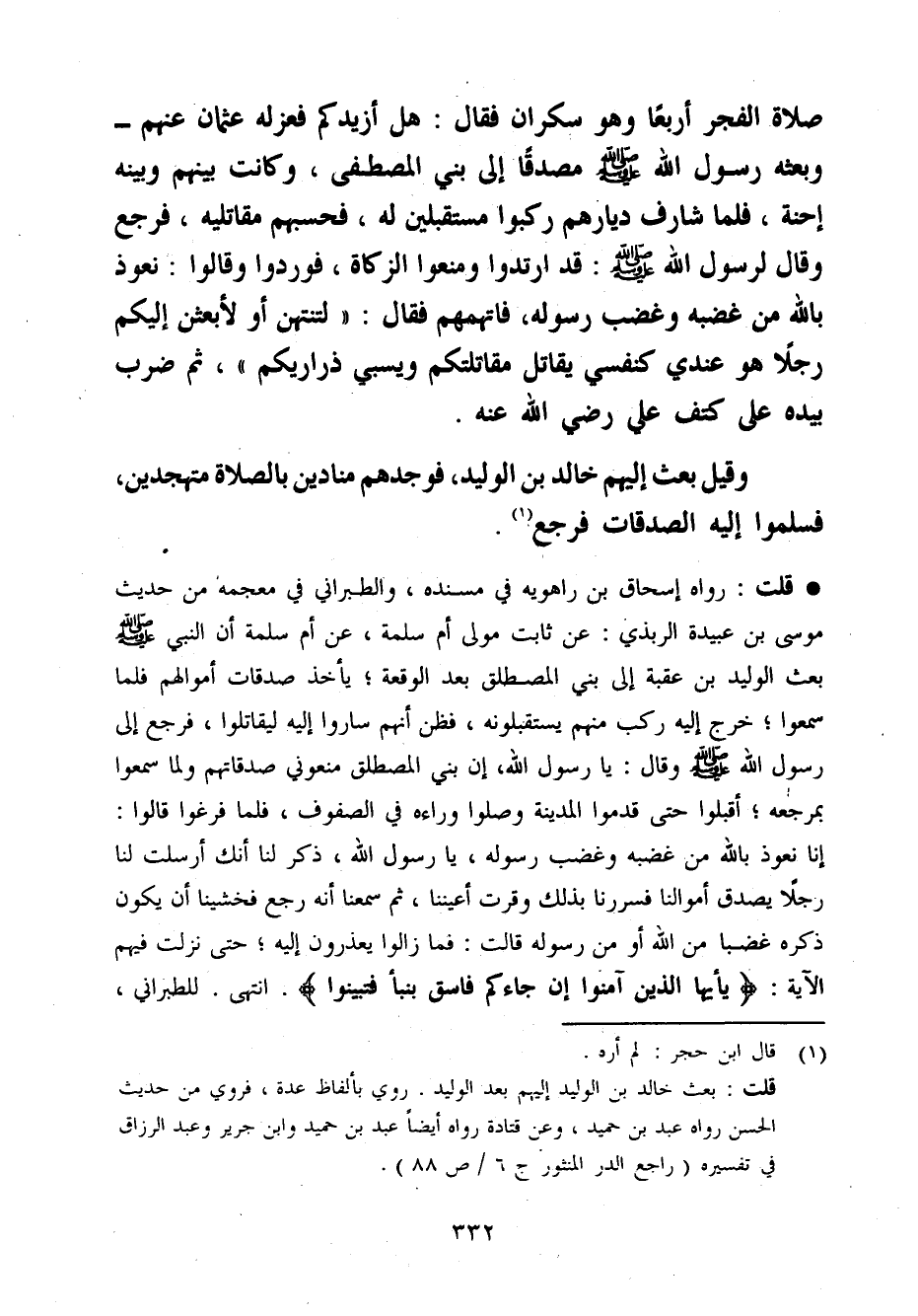 صَلَاة الْفجْر أَرْبعا وَهُوَ سَكرَان فَقَالَ هَل أَزِيدكُم فَعَزله عُثْمَان عَنْهُم وَبَعثه رَسُول الله صَلَّى اللَّهُ عَلَيْهِ وَسَلَّم َ مُصدقا إِلَى بني الْمُصْطَفَى وَكَانَت بَينهم وَبَينه إحْنَة فَلَمَّا شَارف دِيَارهمْ ركبُوا مُسْتَقْبلين لَهُ فحسبهم مُقَاتِلِيهِ فَرجع وَقَالَ لرَسُول الله صَلَّى اللَّهُ عَلَيْهِ وَسَلَّم َ قد ارْتَدُّوا وَمنعُوا الزَّكَاة فَوَرَدُوا وَقَالُوا نَعُوذ بِاللَّه من غَضَبه وَغَضب رَسُوله فَاتَّهمهُمْ فَقَالَ (لتَنْتَهُنَّ أَو لَأَبْعَثَن إِلَيْكُم رجلا هُوَ عِنْدِي كنفسي يُقَاتل مُقَاتِلَتكُمْ وَيَسْبِي ذَرَارِيكُمْ) ثمَّ ضرب بِيَدِهِ عَلَى كتف عَلّي رَضِيَ اللَّهُ عَنْه