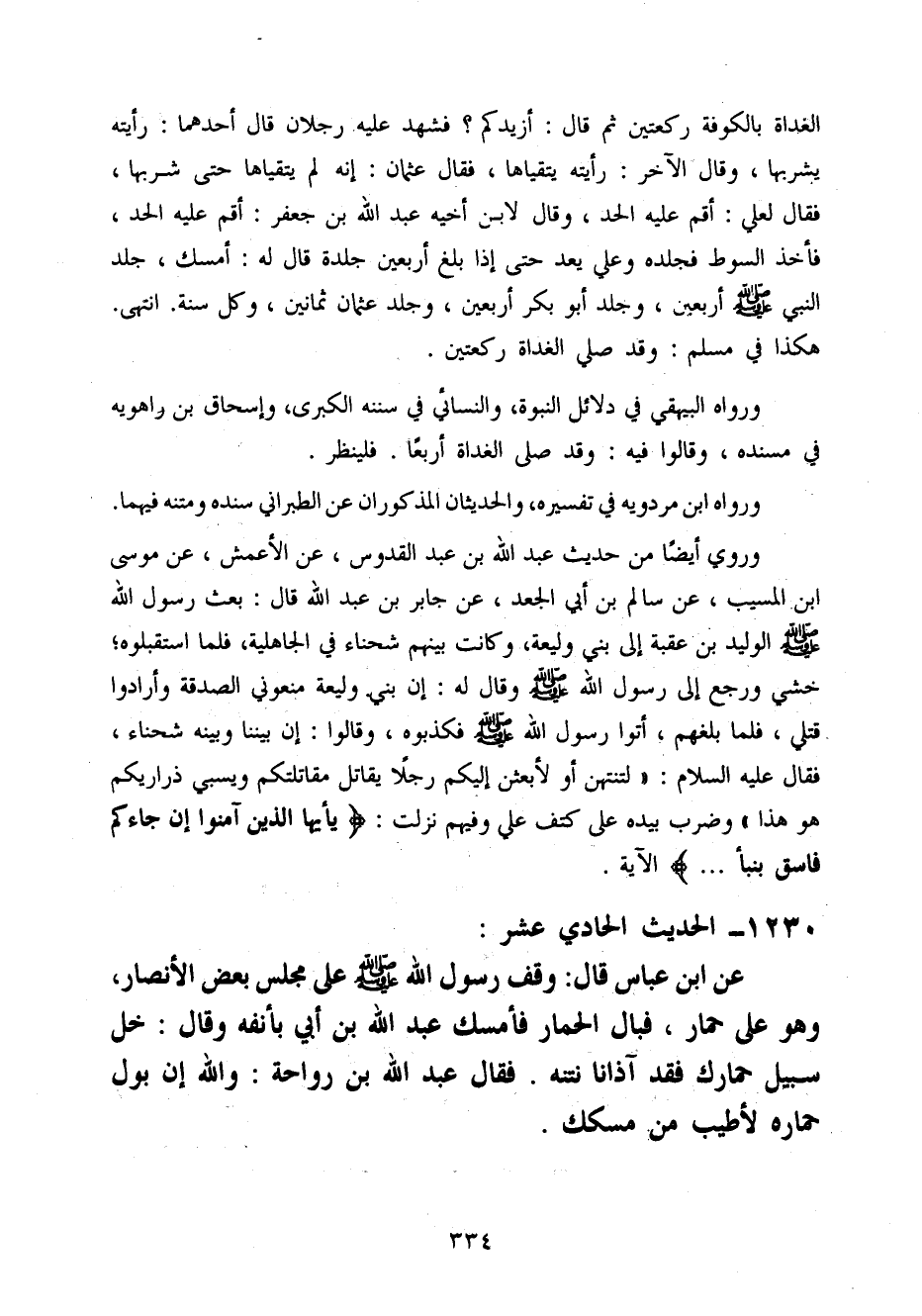 الْغَدَاة بِالْكُوفَةِ رَكْعَتَيْنِ ثمَّ قَالَ أَزِيدكُم فَشهد عَلَيْهِ رجلَانِ قَالَ أَحدهمَا رَأَيْته يشْربهَا وَقَالَ الآخر رَأَيْته يتقياها فَقَالَ عُثْمَان إِنَّه لم يتقياها حَتَّى شربهَا فَقَالَ لعَلي أقِم عَلَيْهِ الْحَد وَقَالَ لِابْنِ أَخِيه عبد الله بن جَعْفَر أقِم عَلَيْهِ الْحَد فَأخذ السَّوْط فجلده وَعلي يعد حَتَّى إِذا بلغ أَرْبَعِينَ جلدَة قَالَ لَهُ أمسك جلد النَّبِي صَلَّى اللَّهُ عَلَيْهِ وَسَلَّم َ أَرْبَعِينَ وَجلد أَبُو بكر أَرْبَعِينَ وَجلد عُثْمَان ثَمَانِينَ وكل سنة انْتَهَى هَكَذَا فِي مُسلم وَقد صلي الْغَدَاة رَكْعَتَيْنِ