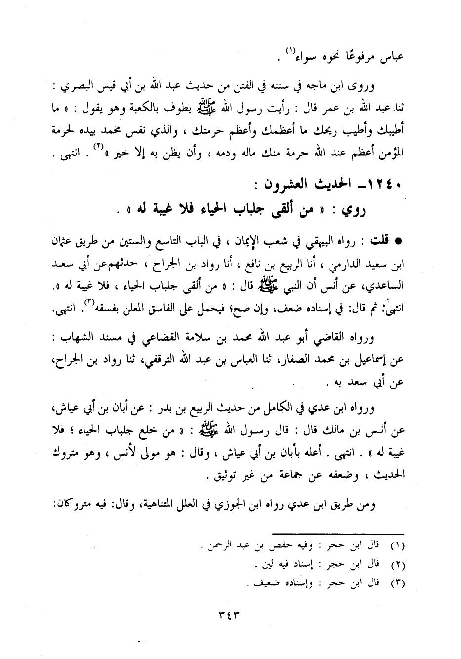 وَرَوَاهُ ابْن عدي فِي الْكَامِل من حَدِيث الرّبيع بن بدر عَن أبان بن أبي عَيَّاش عَن أنس بن مَالك قَالَ قَالَ رَسُول الله صَلَّى اللَّهُ عَلَيْهِ وَسَلَّم َ (من خلع جِلْبَاب الْحيَاء فَلَا غيبَة لَهُ) انْتَهَى أعله بِأَبَان بن أبي عَيَّاش وَقَالَ هُوَ مولَى لأنس وَهُوَ مَتْرُوك الحَدِيث وَضَعفه عَن جمَاعَة من غير تَوْثِيق