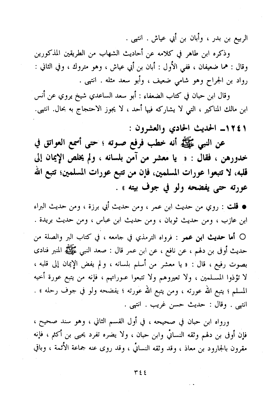 أما حَدِيث ابْن عمر فَرَوَاهُ التِّرْمِذِيّ فِي جَامعه فِي كتاب الْبر والصلة من حَدِيث أَوْفَى بن دلهم عَن نَافِع عَن ابْن عمر قَالَ صعد النَّبِي صَلَّى اللَّهُ عَلَيْهِ وَسَلَّم َ الْمِنْبَر فَنَادَى بِصَوْت رفيع قَالَ (يَا معشر من أسلم بِلِسَانِهِ وَلم يفض الْإِيمَان إِلَى قلبه لَا تُؤْذُوا الْمُسلمين وَلَا تُعَيِّرُوهُمْ وَلَا تتبعوا عَوْرَاتهمْ فَإِنَّهُ من يتبع عَورَة أَخِيه الْمُسلم يتبع الله عَوْرَته وَمن يتبع الله عَوْرَته يَفْضَحهُ وَلَو فِي جَوف رَحْله) انْتَهَى وَقَالَ حَدِيث حسن غَرِيب انْتَهَى