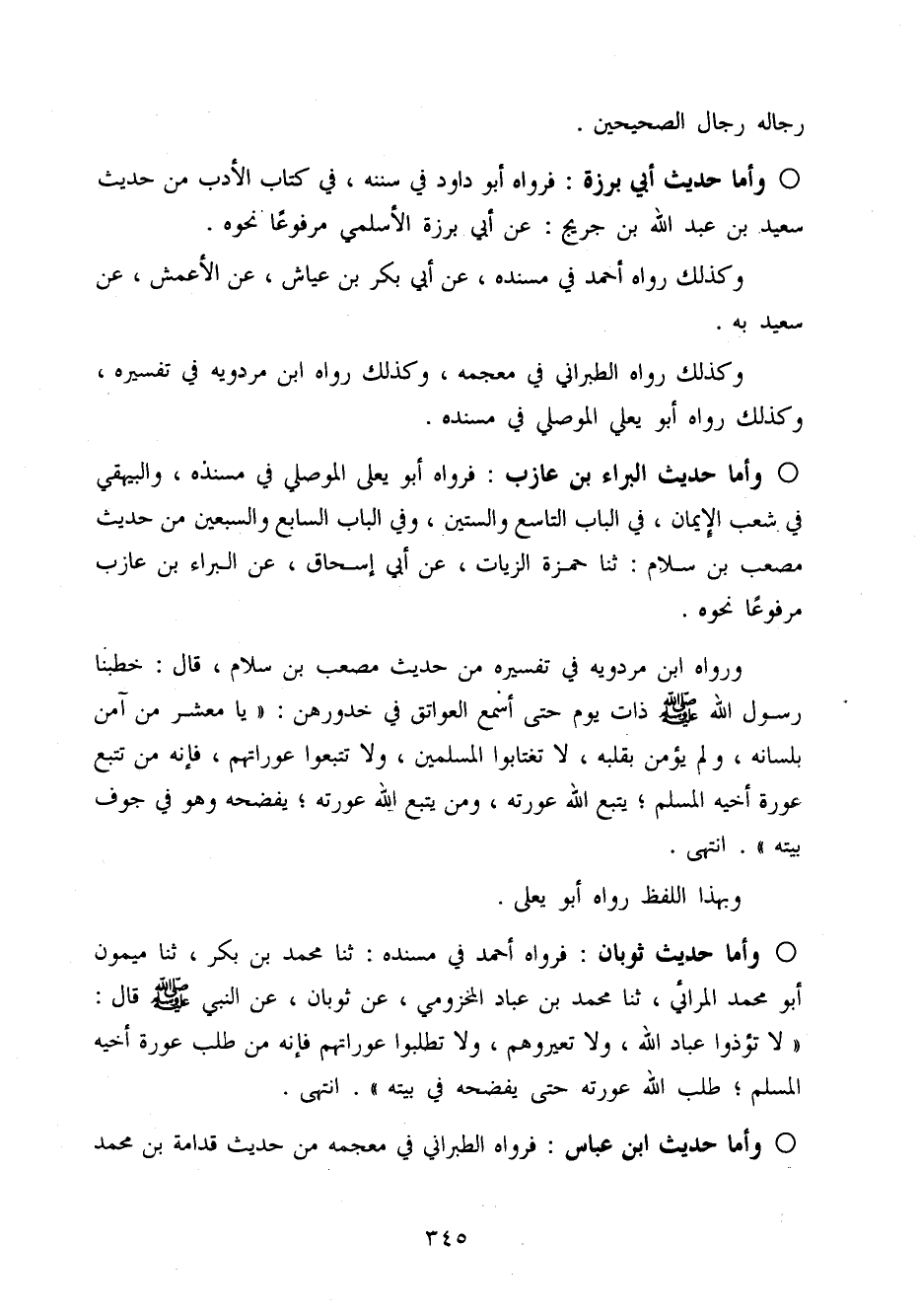 وَرَوَاهُ ابْن مرْدَوَيْه فِي تَفْسِيره من حَدِيث مُصعب بن سَلام قَالَ خَطَبنَا رَسُول الله صَلَّى اللَّهُ عَلَيْهِ وَسَلَّم َ ذَات يَوْم حَتَّى أسمع الْعَوَاتِق فِي خُدُورهنَّ (يَا معشر من آمن بِلِسَانِهِ وَلم يُؤمن بِقَلْبِه لَا تَغْتَابُوا الْمُسلمين وَلَا تتبعوا عَوْرَاتهمْ فَإِنَّهُ من تتبع عَورَة أَخِيه الْمُسلم يتبع الله عَوْرَته وَمن يتبع الله عَوْرَته يَفْضَحهُ وَهُوَ فِي جَوف بَيته) انْتَهَى