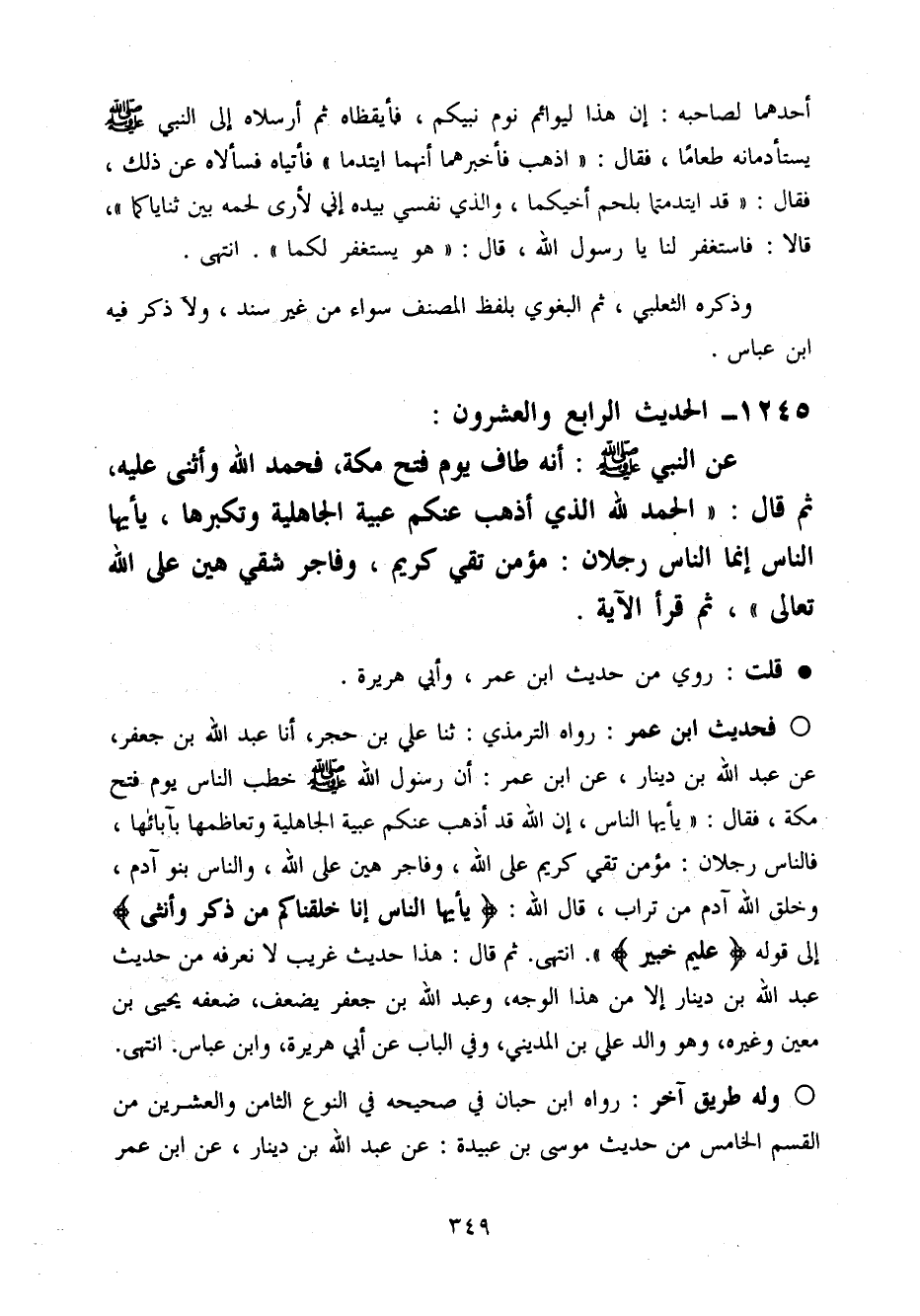 فَحَدِيث ابْن عمر رَوَاهُ التِّرْمِذِيّ ثَنَا عَلّي بن حجر أَنا عبد الله بن جَعْفَر عَن عبد الله بن دِينَار عَن ابْن عمر أَن رَسُول الله صَلَّى اللَّهُ عَلَيْهِ وَسَلَّم َ خطب النَّاس يَوْم فتح مَكَّة فَقَالَ (يأيها النَّاس إِن الله قد أذهب عَنْكُم عبِّيَّة الْجَاهِلِيَّة وَتَعَاظُمهَا بِآبَائِهَا فَالنَّاس رجلَانِ مُؤمن تقى كريم عَلَى الله وَفَاجِر هَين عَلَى الله وَالنَّاس بَنو آدم وَخلق الله آدم من تُرَاب قَالَ الله يأيها النَّاس إِنَّا خَلَقْنَاكُمْ من ذكر وَأُنْثَى إِلَى قَوْله عليم خَبِير انْتَهَى ثمَّ قَالَ هَذَا حَدِيث غَرِيب لَا نعرفه من حَدِيث عبد الله بن دِينَار إِلَّا من هَذَا الْوَجْه وَعبد الله بن جَعْفَر يضعف ضعفه يَحْيَى بن معِين وَغَيره وَهُوَ وَالِد عَلّي بن الْمَدِينِيّ وَفِي الْبَاب عَن أبي هُرَيْرَة وَابْن عَبَّاس انْتَهَى