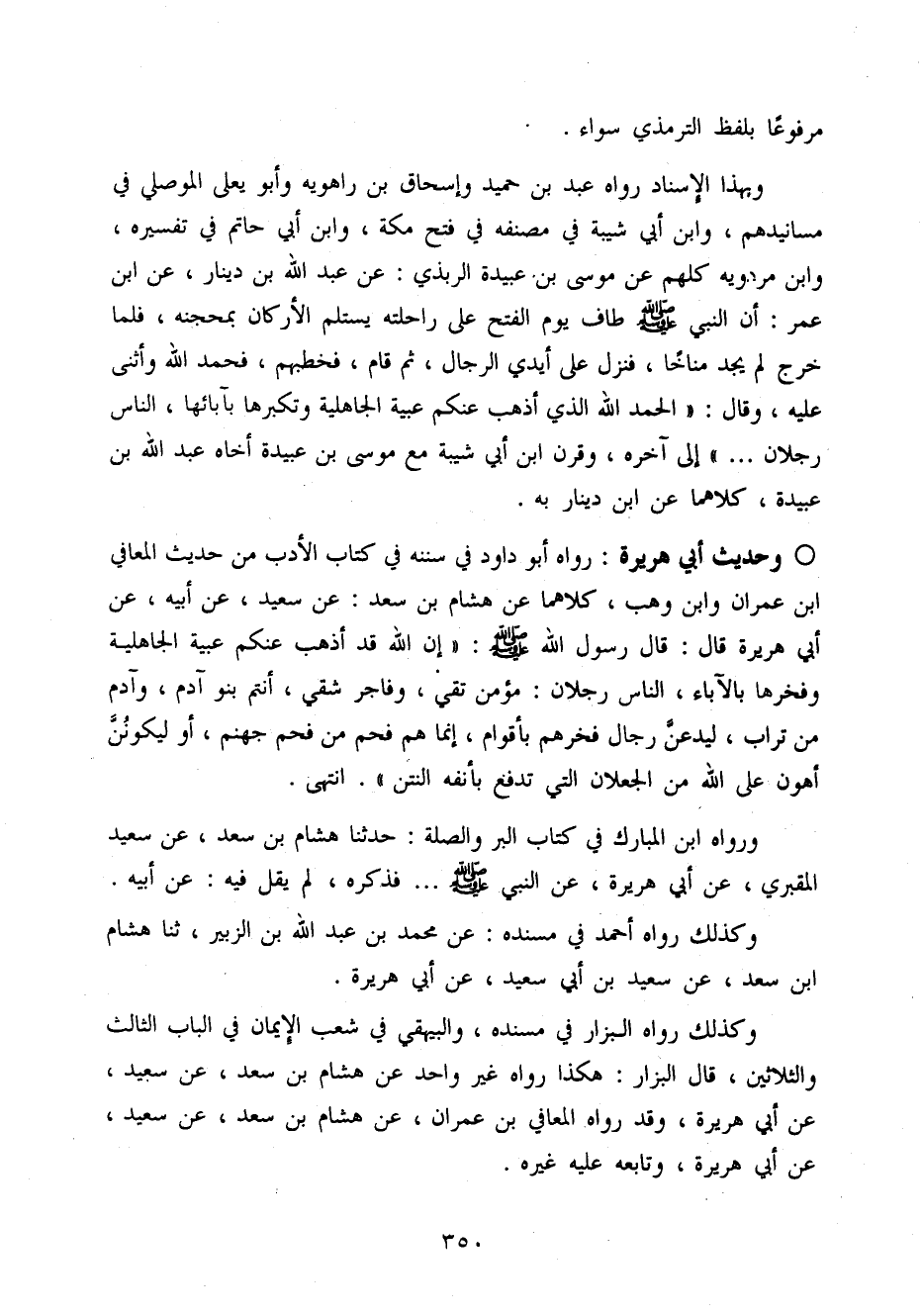 وَبِهَذَا الْإِسْنَاد رَوَاهُ عبد بن حميد وَإِسْحَاق بن رَاهَوَيْه وَأَبُو يعلي الْموصِلِي فِي مسانيدهم وَابْن أبي شيبَة فِي مُصَنفه فِي فتح مَكَّة وَابْن أبي حَاتِم فِي تَفْسِيره وَابْن مرْدَوَيْه كلهم عَن مُوسَى بن عُبَيْدَة الربذي عَن عبد الله بن دِينَار عَن ابْن عمر أَن النَّبِي صَلَّى اللَّهُ عَلَيْهِ وَسَلَّم َ طَاف يَوْم الْفَتْح عَلَى رَاحِلَته يسْتَلم الْأَركان بِمِحْجَنِهِ فَلَمَّا خرج لم يجد منَاخًا فَنزل عَلَى أَيدي الرِّجَال ثمَّ قَامَ فخطبهم فَحَمدَ الله وَأَثْنَى عَلَيْهِ وَقَالَ (الْحَمد لله الَّذِي اذْهَبْ عَنْكُم عبِّيَّة الْجَاهِلِيَّة وَتَكَبُّرهَا بِآبَائِهَا النَّاس رجلَانِ) إِلَى آخِره وَقرن ابْن أبي شيبَة مَعَ مُوسَى بن عُبَيْدَة أَخَاهُ عبد الله بن عُبَيْدَة كِلَاهُمَا عَن ابْن دِينَار بِهِ