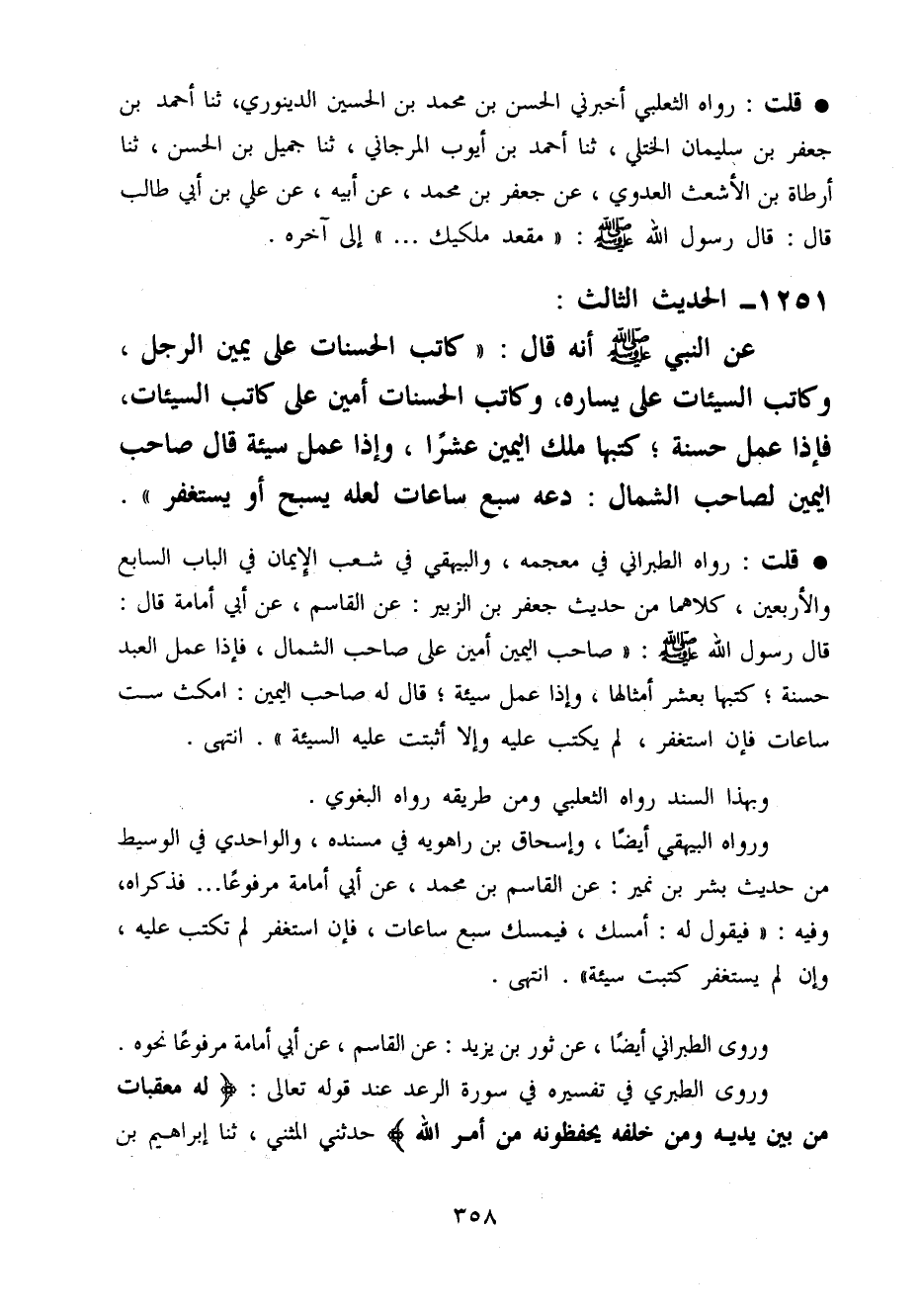 1251 - الحَدِيث الثَّالِث عَن النَّبِي صَلَّى اللَّهُ عَلَيْهِ وَسَلَّم َ أَنه قَالَ (كَاتب الْحَسَنَات عَلَى يَمِين الرجل وَكَاتب السَّيِّئَات عَلَى يسَاره وَكَاتب الْحَسَنَات أَمِين عَلَى كَاتب السَّيِّئَات فَإِذا عمل حَسَنَة كتبهَا ملك الْيَمين عشرا وَإِذا عمل سَيِّئَة قَالَ صَاحب الْيَمين صَاحب الشمَال دَعه سبع سَاعَات لَعَلَّه يسبح أَو يسْتَغْفر)