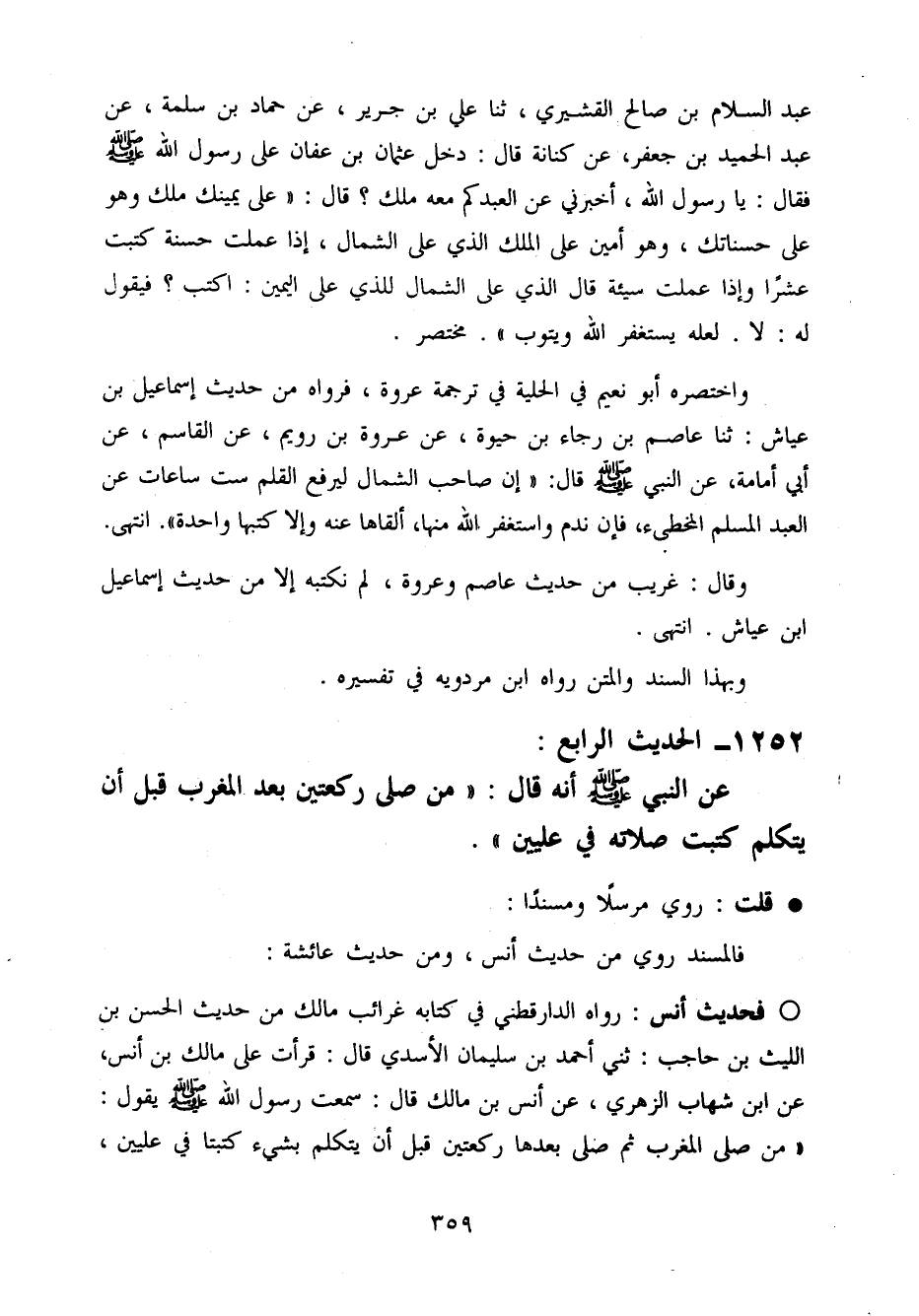 عبد السَّلَام بن صَالح الْقشيرِي ثَنَا عَلّي بن جرير عَن حَمَّاد بن سَلمَة عَن عبد الحميد بن جَعْفَر عَن كنَانَة قَالَ دخل عُثْمَان بن عَفَّان عَلَى رَسُول الله صَلَّى اللَّهُ عَلَيْهِ وَسَلَّم َ فَقَالَ يَا رَسُول الله أَخْبرنِي عَن العَبْد كم مَعَه ملك قَالَ (عَلَى يَمِينك ملك وَهُوَ عَلَى حَسَنَاتك وَهُوَ أَمِين عَلَى الْملك الَّذِي عَلَى الشمَال إِذا عملت حَسَنَة كتبت عشرا وَإِذا عملت سَيِّئَة قَالَ الَّذِي عَلَى الشمَال للَّذي عَلَى الْيَمين اكْتُبْ فَيَقُول لَهُ لَا لَعَلَّه يسْتَغْفر الله وَيَتُوب) مُخْتَصر