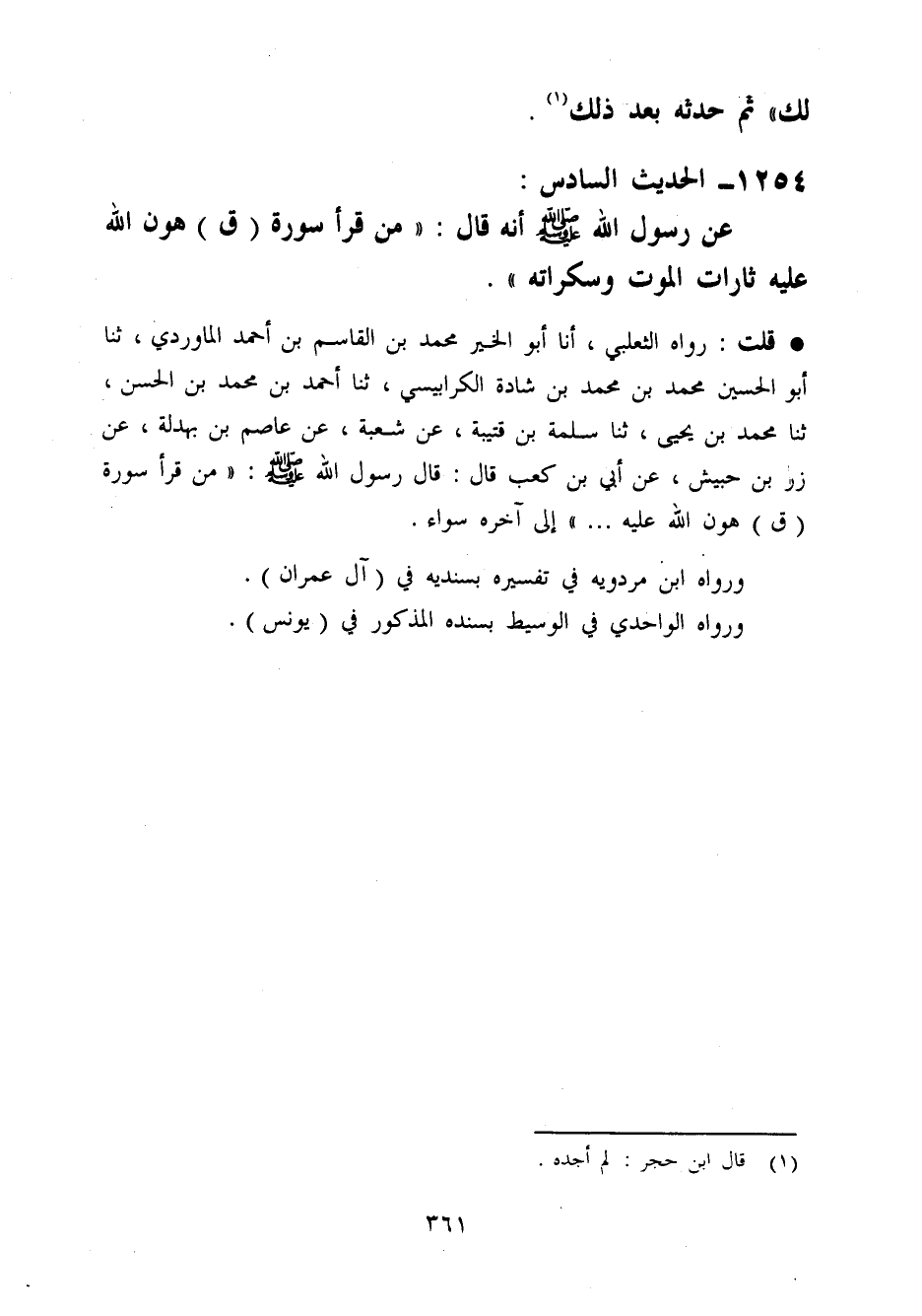 قلت رَوَاهُ الثَّعْلَبِيّ أَنا أَبُو الْخَيْر مُحَمَّد بن الْقَاسِم بن أَحْمد الْمَاوَرْدِيّ ثَنَا أَبُو الْحُسَيْن مُحَمَّد بن مُحَمَّد بن شَادَّة الْكَرَابِيسِي ثَنَا أَحْمد بن مُحَمَّد بن الْحسن ثَنَا مُحَمَّد بن يَحْيَى ثَنَا سَلمَة بن قُتَيْبَة عَن شُعْبَة عَن عَاصِم بن بهدله عَن زر بن حُبَيْش عَن أبي بن كَعْب قَالَ قَالَ رَسُول الله صَلَّى اللَّهُ عَلَيْهِ وَسَلَّم َ (من قَرَأَ سُورَة ق هون الله عَلَيْهِ) إِلَى آخِره سَوَاء