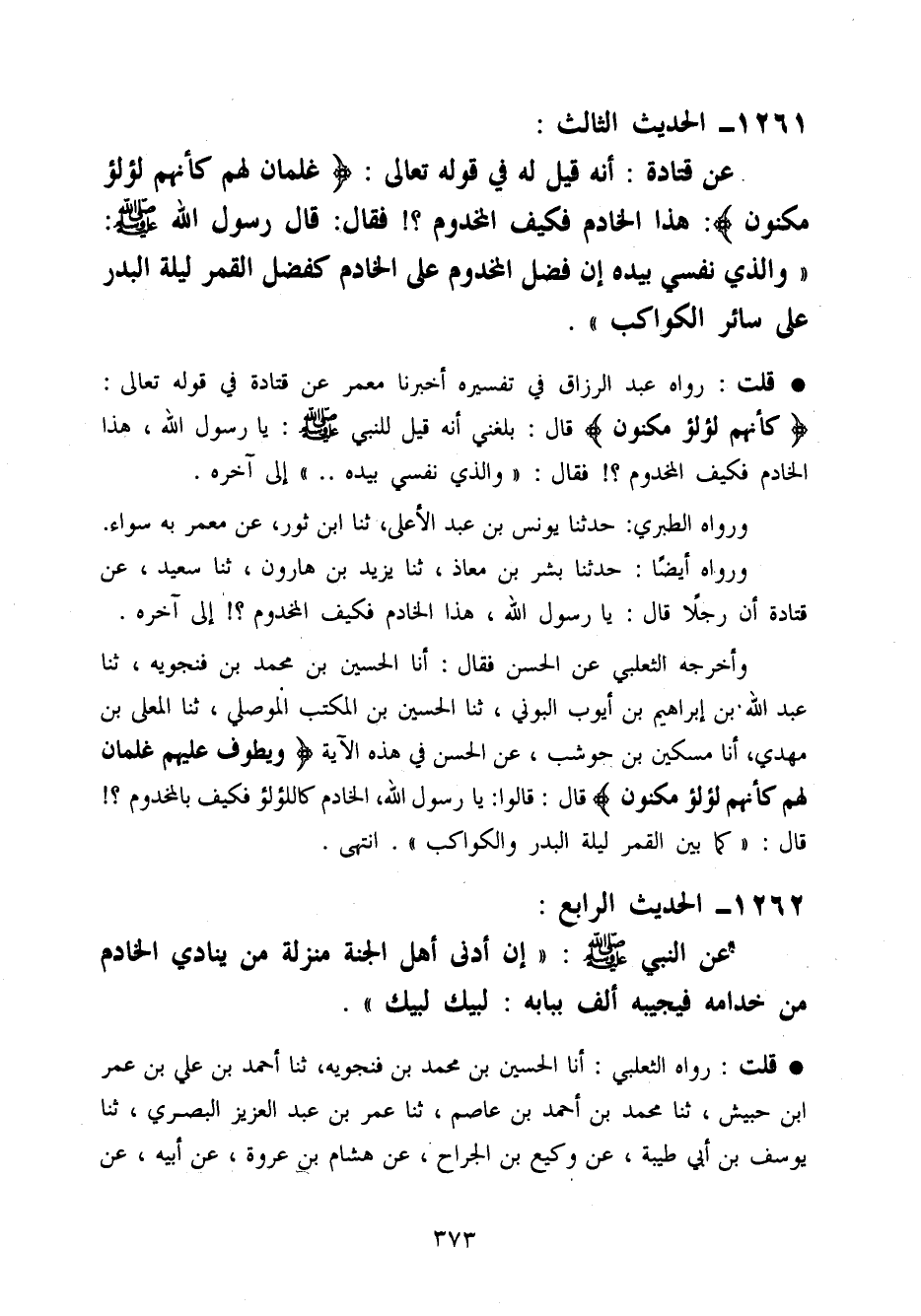 عَن قَتَادَة أَنه قيل لَهُ فِي قَوْله تَعَالَى (غلْمَان لَهُم كَأَنَّهُمْ لُؤْلُؤ مَكْنُون) هَذَا الْخَادِم فَكيف المخدوم فَقَالَ قَالَ رَسُول الله صَلَّى اللَّهُ عَلَيْهِ وَسَلَّم َ (وَالَّذِي نَفسِي بِيَدِهِ إِن فضل المخدوم عَلَى الْخَادِم كفضل الْقَمَر لَيْلَة الْبَدْر عَلَى سَائِر الْكَوَاكِب)