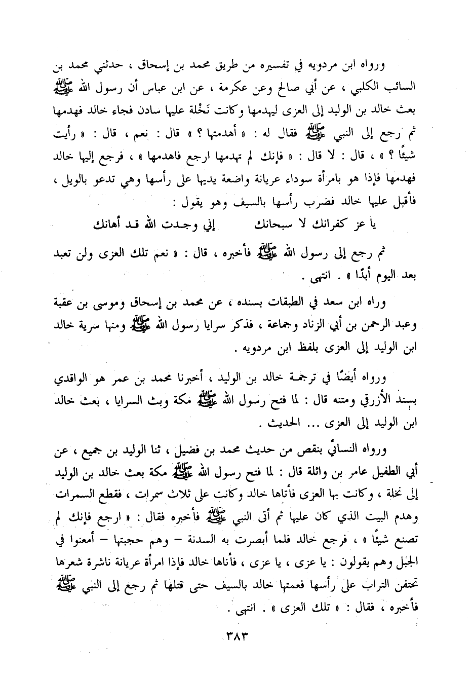 وَرَوَاهُ ابْن سعد فِي الطَّبَقَات بِسَنَدِهِ عَن مُحَمَّد بن إِسْحَاق ومُوسَى بن عقبَة وَعبد الرَّحْمَن بن أبي الزِّنَاد وَجَمَاعَة فَذكر سَرَايَا رَسُول الله صَلَّى اللَّهُ عَلَيْهِ وَسَلَّم َ وَمِنْهَا سَرِيَّة خَالِد ابْن الْوَلِيد إِلَى الْعُزَّى بِلَفْظ ابْن مرْدَوَيْه