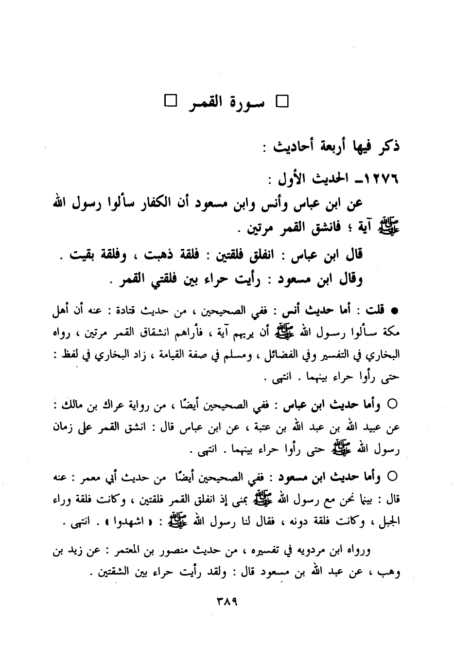 وَأما حَدِيث ابْن عَبَّاس فَفِي الصَّحِيحَيْنِ أَيْضا من رِوَايَة عرَاك بن مَالك عَن عبيد الله بن عبد الله بن عتبَة عَن ابْن عَبَّاس قَالَ انْشَقَّ الْقَمَر عَلَى زمَان رَسُول الله صَلَّى اللَّهُ عَلَيْهِ وَسَلَّم َ حَتَّى رَأَوْا حراء بَينهمَا انْتَهَى