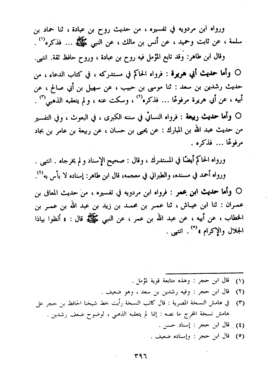 وَأما حَدِيث ابْن عمر فَرَوَاهُ ابْن مرْدَوَيْه فِي تَفْسِيره من حَدِيث الْمعَافى بن عمرَان ثَنَا ابْن عَيَّاش ثَنَا عمر بن مُحَمَّد بن زيد بن عبد الله بن عمر بن الْخطاب عَن أَبِيه عَن عبد الله بن عمر عَن النَّبِي صَلَّى اللَّهُ عَلَيْهِ وَسَلَّم َ قَالَ (أَلظُّوا بِيَاذَا الْجلَال وَالْإِكْرَام) انْتَهَى