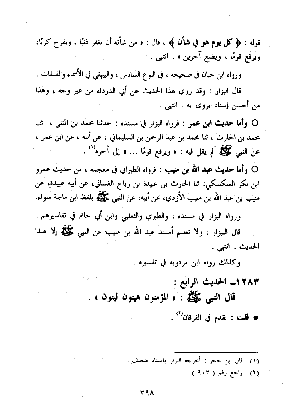 وَأما حَدِيث ابْن عمر فَرَوَاهُ الْبَزَّار فِي مُسْنده حَدثنَا مُحَمَّد بن الْمثنى ثَنَا مُحَمَّد بن الْحَارِث ثَنَا مُحَمَّد بن عبد الرَّحْمَن بن السَّلمَانِي عَن أَبِيه عَن ابْن عمر عَن النَّبِي صَلَّى اللَّهُ عَلَيْهِ وَسَلَّم َ لم يقل فِيهِ وَيرْفَع قوما ... إِلَى آخِره