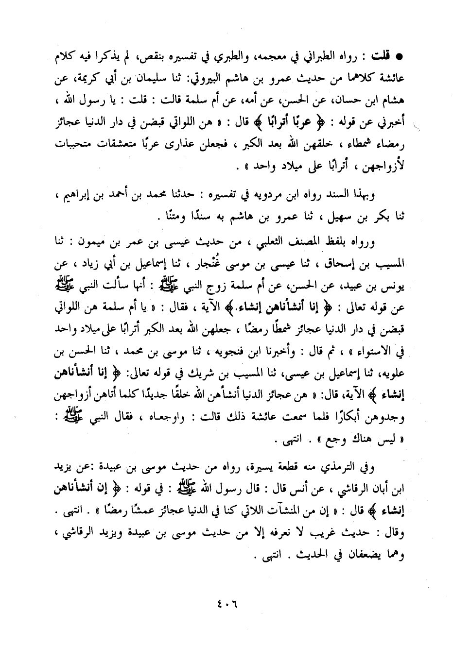 قلت رَوَاهُ الطَّبَرَانِيّ فِي مُعْجَمه والطبري فِي تَفْسِيره بِنَقص لم يذكرَا فِيهِ كَلَام عَائِشَة كِلَاهُمَا من حَدِيث عَمْرو بن هَاشم الْبَيْرُوتِي ثَنَا سُلَيْمَان بن أبي كَرِيمَة عَن هِشَام ابْن حسان عَن الْحسن عَن أمه عَن أم سَلمَة قَالَت قلت يَا رَسُول الله أَخْبرنِي عَن قَوْله عربا أَتْرَابًا قَالَ هن اللواتي قبضن فِي دَار الدُّنْيَا عَجَائِز رَمْضَاءُ شَمْطَاء خَلقهنَّ الله بعد الْكبر فَجعلْنَ عذارى عربا مُتَعَشقَات مُتَحَببَات لِأَزْوَاجِهِنَّ أَتْرَابًا عَلَى مِيلَاد وَاحِد)