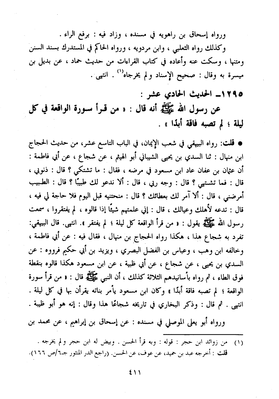 قلت رَوَاهُ الْبَيْهَقِيّ فِي شعب الْإِيمَان فِي الْبَاب التَّاسِع عشر من حَدِيث الْحجَّاج ابْن منهال ثَنَا السّديّ بن يَحْيَى الشَّيْبَانِيّ أَبُو الْهَيْثَم عَن شُجَاع عَن أبي فَاطِمَة أَن عُثْمَان بن عَفَّان عَاد ابْن مَسْعُود فِي مَرضه فَقَالَ مَا تَشْتَكِي قَالَ ذُنُوبِي قَالَ فَمَا تشْتَهي قَالَ وَجه رَبِّي قَالَ أَلا نَدْعُو لَك طَبِيبا قَالَ الطَّبِيب أَمْرَضَنِي قَالَ أَلا آمُر لَك بِعَطَائِك قَالَ منحتنيه قبل الْيَوْم فَلَا حَاجَة لي فِيهِ قَالَ تَدعه لأهْلك وَعِيَالك قَالَ إِنِّي عَلَّمْتهمْ شَيْئا إِذا قَالُوهُ لم يَفْتَقِرُوا سَمِعت رَسُول الله صَلَّى اللَّهُ عَلَيْهِ وَسَلَّم َ يَقُول (من قَرَأَ الْوَاقِعَة كل لَيْلَة لم يفْتَقر)