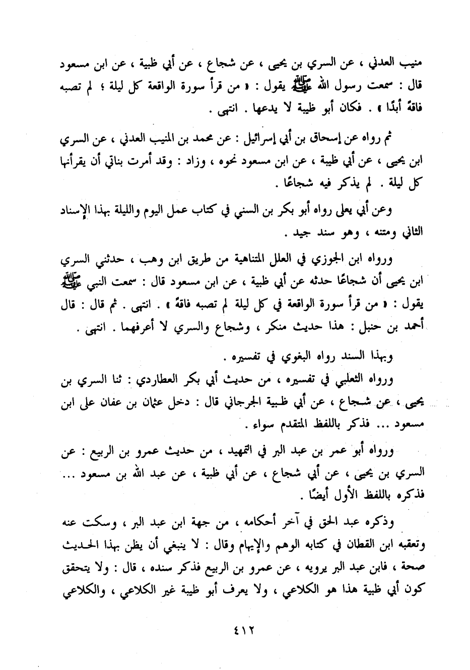 منيب الْعَدنِي عَن السّري بن يَحْيَى عَن شُجَاع عَن أبي ظَبْيَة عَن ابْن مَسْعُود قَالَ سَمِعت رَسُول الله صَلَّى اللَّهُ عَلَيْهِ وَسَلَّم َ يَقُول (من قَرَأَ سُورَة الْوَاقِعَة كل لَيْلَة لم تصبه فاقة أبدا) فَكَانَ أَبُو ظَبْيَة لَا يَدعهَا