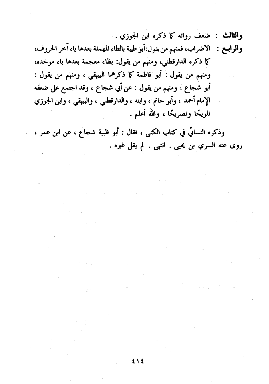 وَالرَّابِع الإضراب فَمنهمْ من يَقُول أَبُو طيبَة بِالطَّاءِ الْمُهْملَة بعْدهَا يَاء آخر الْحُرُوف كَمَا ذكره الدَّارَقُطْنِيّ وَمِنْهُم من يَقُول بِظَاء مُعْجَمه بعْدهَا بَاء موحده وَمِنْهُم من يَقُول أَبُو فَاطِمَة كَمَا ذكرهمَا الْبَيْهَقِيّ وَمِنْهُم من يَقُول أَبُو شُجَاع وَمِنْهُم من يَقُول عَن أبي شُجَاع وَقد اجْتمع عَلَى ضعفه الإِمَام أَحْمد وَأَبُو حَاتِم وَابْنه وَالدَّارَقُطْنِيّ وَالْبَيْهَقِيّ وَابْن الْجَوْزِيّ تَلْوِيحًا وَتَصْرِيحًا وَالله أعلم