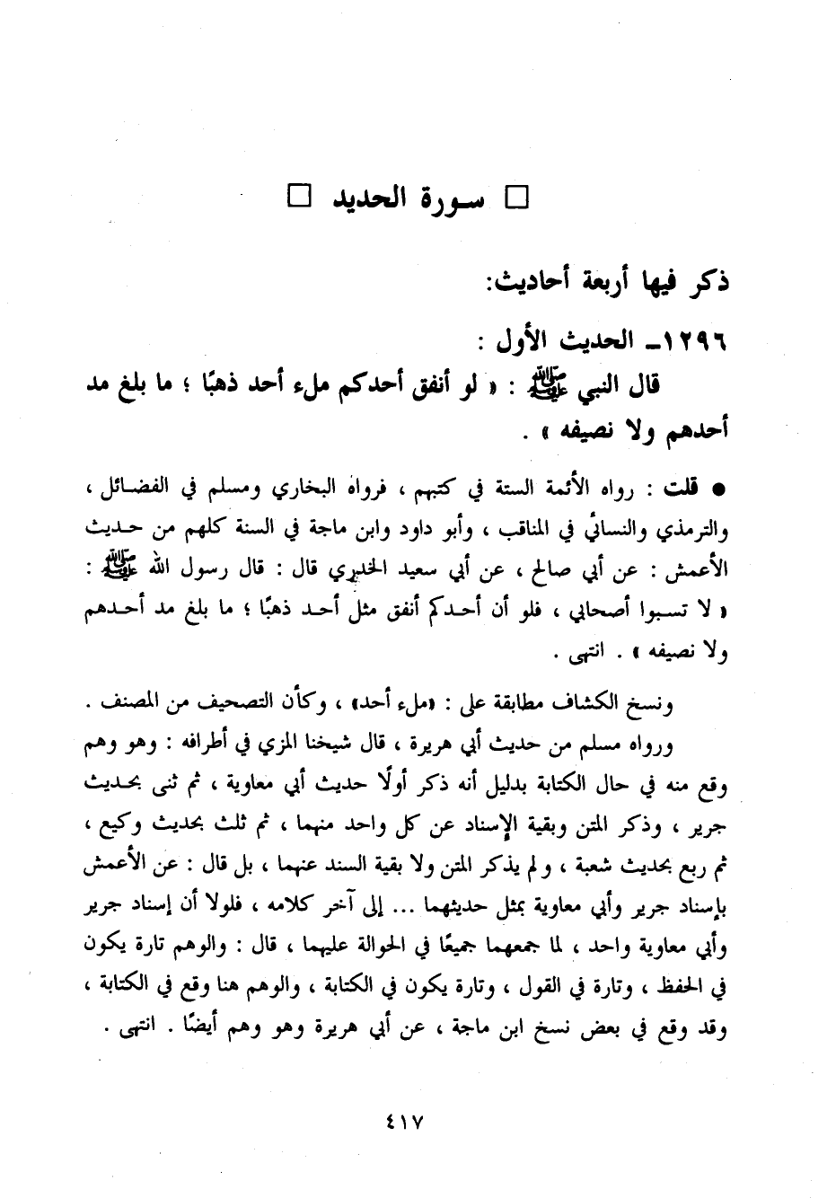 1296 - الحَدِيث الأول قَالَ النَّبِي صَلَّى اللَّهُ عَلَيْهِ وَسَلَّم َ (لَو أنْفق أحدكُم ملْء أحد ذَهَبا مَا بلغ مد أحدهم وَلَا نصيفه)