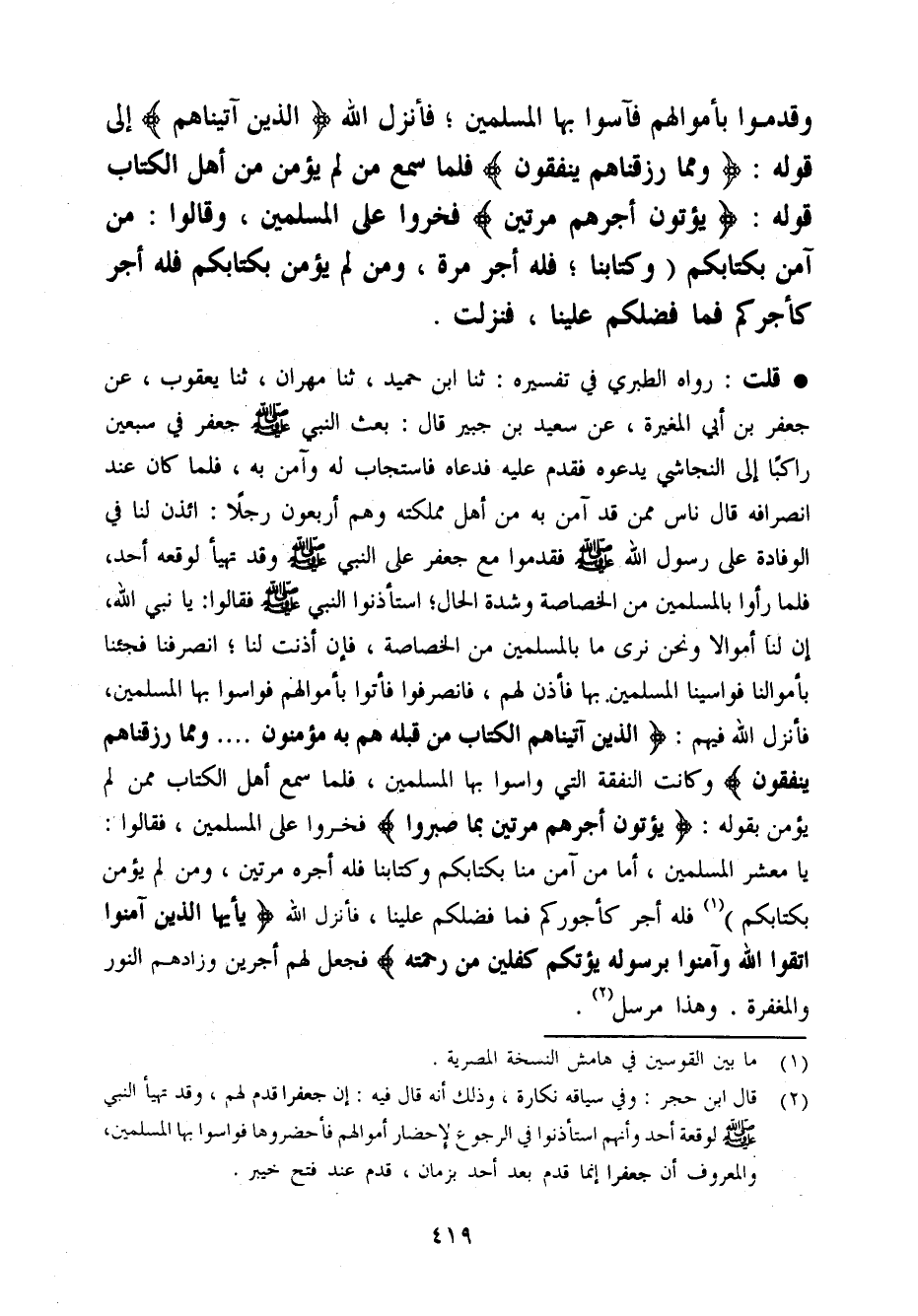 قلت رَوَاهُ الطَّبَرِيّ فِي تَفْسِيره ثَنَا ابْن حميد ثَنَا مهْرَان ثَنَا يَعْقُوب عَن جَعْفَر بن أبي الْمُغيرَة عَن سعيد بن جُبَير قَالَ بعث النَّبِي صَلَّى اللَّهُ عَلَيْهِ وَسَلَّم َ جَعْفَر فِي سبعين رَاكِبًا إِلَى النَّجَاشِيّ يَدعُوهُ فَقدم عَلَيْهِ فَدَعَاهُ فَاسْتَجَاب لَهُ وآمن بِهِ فَلَمَّا كَانَ عِنْد انْصِرَافه قَالَ نَاس مِمَّن آمن بِهِ من أهل مَمْلَكَته وهم أَرْبَعُونَ رجلا ائْذَنْ لنا فِي الْوِفَادَة عَلَى رَسُول الله صَلَّى اللَّهُ عَلَيْهِ وَسَلَّم َ فقدموا مَعَ جَعْفَر عَلَى النَّبِي صَلَّى اللَّهُ عَلَيْهِ وَسَلَّم َ وَقد تهَيَّأ لِوَقْعِهِ أحد فَلَمَّا رَأَوْا بِالْمُسْلِمين من الْخَصَاصَة وَشدَّة الْحَال اسْتَأْذنُوا النَّبِي صَلَّى اللَّهُ عَلَيْهِ وَسَلَّم َ فَقَالُوا يَا نَبِي الله إِن لنا أَمْوَالًا وَنحن نرَى مَا بِالْمُسْلِمين من الْخَصَاصَة فَإِن أَذِنت لنا انصرفنا فَجِئْنَا بِأَمْوَالِنَا فواسينا الْمُسلمين بهَا فَأذن لَهُم فانصرفوا فَأتوا بِأَمْوَالِهِمْ فَوَاسَوْا بهَا الْمُسلمين فَأنْزل الله فيهم الَّذين آتَيْنَاهُم الْكتاب من قبله هم بِهِ مُؤمنُونَ وَمِمَّا رَزَقْنَاهُمْ يُنْفقُونَ وَكَانَت النَّفَقَة الَّتِي وَاسَوْا بهَا الْمُسلمين فَلَمَّا سمع أهل الْكتاب مِمَّن لم يُؤمن بقوله يُؤْتونَ أجرهم مرَّتَيْنِ بِمَا صَبَرُوا فَخَروا عَلَى الْمُسلمين فَقَالُوا يَا معشر الْمُسلمين أما من آمن منا بِكِتَابِكُمْ وَكِتَابنَا فَلهُ أجره مرَّتَيْنِ وَمن لم يُؤمن بِكِتَابِكُمْ فَلهُ أجر كَأُجُورِكُمْ فَمَا فَضلكُمْ علينا فَأنْزل الله (يأيها الَّذين آمنُوا اتَّقوا الله وآمنوا بِرَسُولِهِ يُؤْتكُم كِفْلَيْنِ من رَحمته) فَجعل لَهُم أَجْرَيْنِ وَزَادَهُمْ النُّور وَالْمَغْفِرَة
