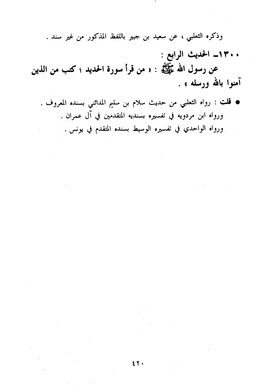 1300 - الحَدِيث الرَّابِع عَن رَسُول الله صَلَّى اللَّهُ عَلَيْهِ وَسَلَّم َ (من قَرَأَ سُورَة الْحَدِيد كتب من الَّذين آمنُوا بِاللَّه وَرُسُله)
