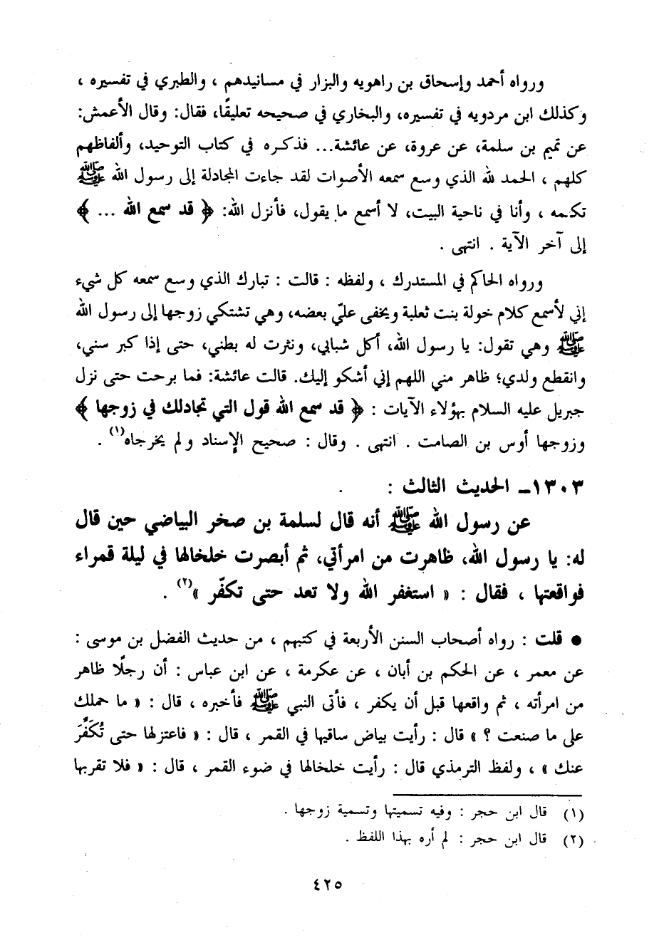 1303 - الحَدِيث الثَّالِث عَن رَسُول الله صَلَّى اللَّهُ عَلَيْهِ وَسَلَّم َ أَنه قَالَ لسَلمَة بن صَخْر البياضي حِين قَالَ لَهُ يَا رَسُول الله ظَاهَرت من امْرَأَتي ثمَّ أَبْصرت خلْخَالهَا فِي لَيْلَة قَمْرَاء فَوَاقَعْتهَا فَقَالَ (اسْتغْفر الله وَلَا تعد حَتَّى تكفر