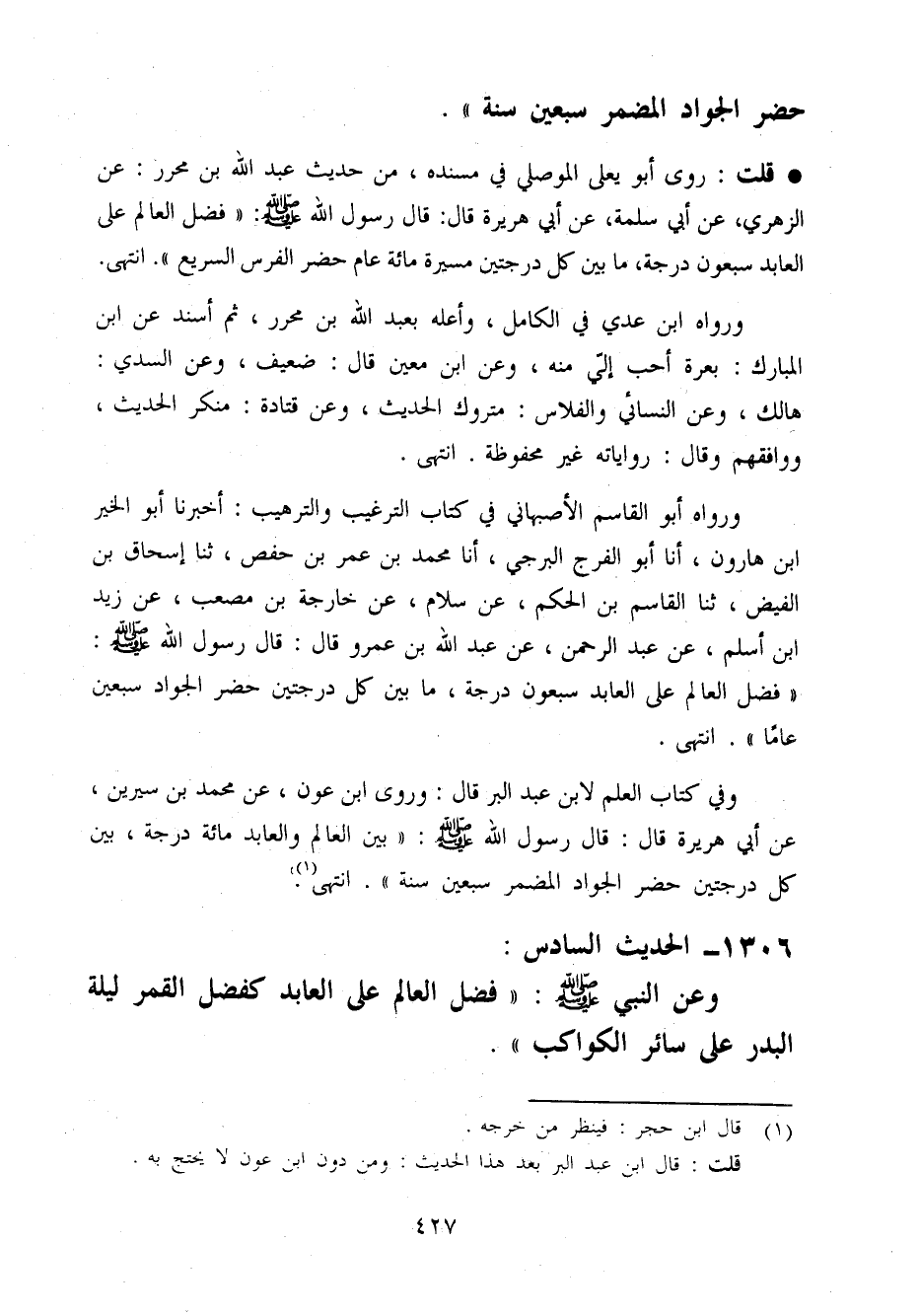 قلت رَوَى أَبُو يعلي الْموصِلِي فِي مُسْنده من حَدِيث عبد الله بن مُحَرر عَن الزُّهْرِيّ عَن أبي سَلمَة عَن أبي هُرَيْرَة قَالَ قَالَ رَسُول الله صَلَّى اللَّهُ عَلَيْهِ وَسَلَّم َ (فضل الْعَالم عَلَى العابد سَبْعُونَ دَرَجه مَا بَين كل دَرَجَتَيْنِ مسيرَة مائَة عَام حضر الْفرس السَّرِيع) انْتَهَى