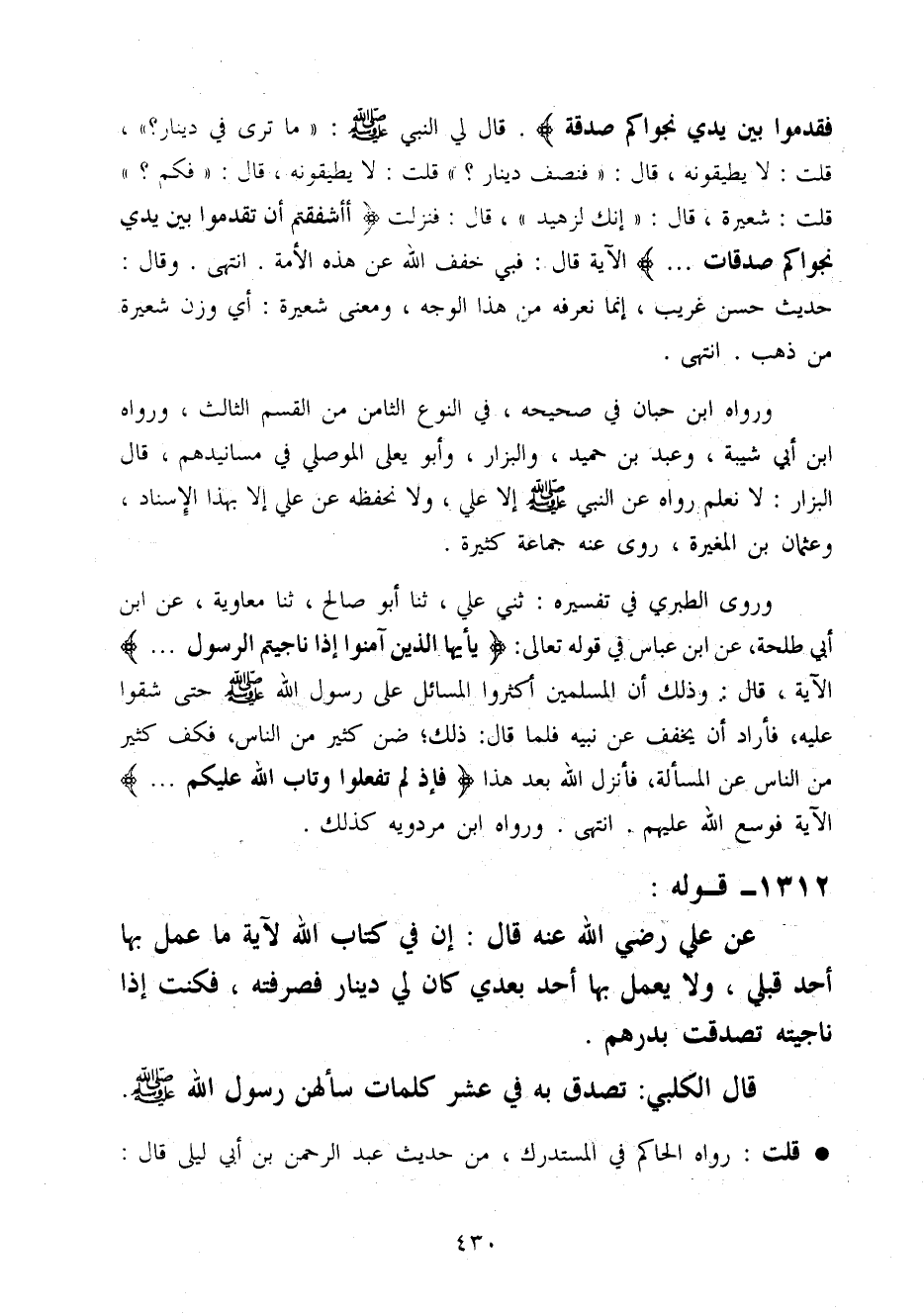 1312 - قَوْله عَن عَلّي رَضِيَ اللَّهُ عَنْه قَالَ إِن فِي كتاب الله لآيَة مَا عمل بهَا أحد قبلي وَلَا بِعَمَل بهَا أحد بعدِي كَانَ لي دِينَار فَصَرَفته فَكنت إِذا نَاجَيْته تَصَدَّقت بدرهم