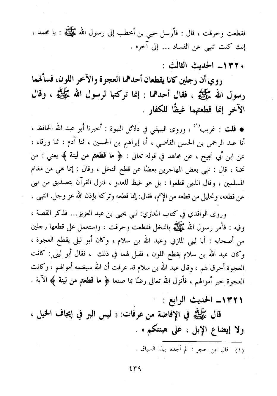 1320 - الحَدِيث الثَّالِث رُوِيَ أَن رجلَيْنِ كَانَا يقْطَعَانِ أَحدهمَا الْعَجْوَة وَالْآخر اللَّوْن فَسَأَلَهُمَا رَسُول الله صَلَّى اللَّهُ عَلَيْهِ وَسَلَّم َ فَقَالَ أَحدهمَا إِنَّمَا تركتهَا لرَسُول الله صَلَّى اللَّهُ عَلَيْهِ وَسَلَّم َ وَقَالَ الآخر إِنَّمَا قَطَعْتهمَا غيظا للْكفَّار