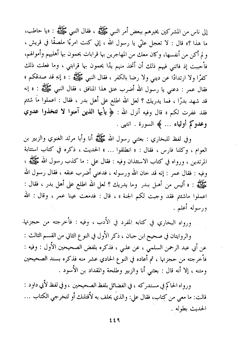 وَفِي لفظ للْبُخَارِيّ بَعَثَنِي رَسُول الله صَلَّى اللَّهُ عَلَيْهِ وَسَلَّم َ أَنا وَأَبا مرْثَد الغنوي وَالزُّبَيْر بن الْعَوام وكلنَا فَارس فَقَالَ انْطَلقُوا الحَدِيث ذكره فِي كتاب اسْتِتَابَة الْمُرْتَدين وَرَوَاهُ فِي كتاب الاسْتِئْذَان وَفِيه فَقَالَ عَلّي مَا كذب رَسُول الله صَلَّى اللَّهُ عَلَيْهِ وَسَلَّم َ وَفِيه فَقَالَ عمر إِنَّه قد خَان الله وَرَسُوله فَدَعْنِي أضْرب عُنُقه فَقَالَ رَسُول الله صَلَّى اللَّهُ عَلَيْهِ وَسَلَّم َ (أَلَيْسَ من أهل بدر وَمَا يدْريك لَعَلَّ الله اطلع عَلَى أهل بدر فَقَالَ اعْمَلُوا مَا شِئْتُم فقد وَجَبت لكم الْجنَّة) قَالَ فَدَمَعَتْ عينا عمر وَقَالَ الله وَرَسُوله أعلم