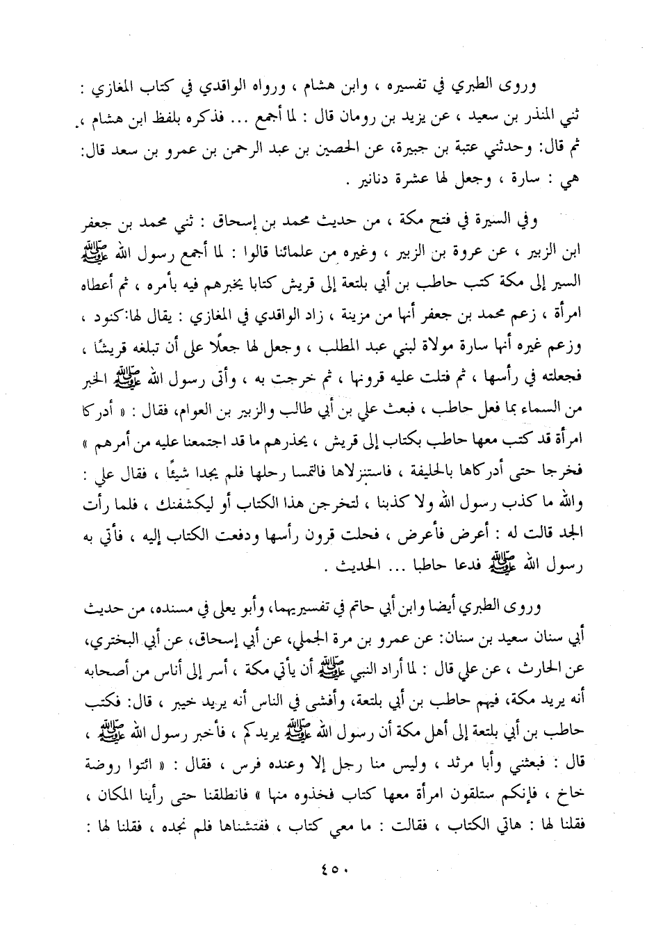 وَفِي السِّيرَة فِي فتح مَكَّة من حَدِيث مُحَمَّد بن إِسْحَاق ثني مُحَمَّد بن جَعْفَر ابْن الزُّبَيْر عَن عُرْوَة بن الزُّبَيْر وَغَيره من عُلَمَائِنَا قَالُوا لما أجمع رَسُول الله صَلَّى اللَّهُ عَلَيْهِ وَسَلَّم َ السّير إِلَى مَكَّة كتب حَاطِب بن أبي بلتعة إِلَى قُرَيْش كتابا يُخْبِرهُمْ فِيهِ بأَمْره ثمَّ أعطَاهُ امْرَأَة زعم مُحَمَّد بن جَعْفَر أَنَّهَا من مزينة زَاد الْوَاقِدِيّ فِي الْمَغَازِي يُقَال لَهَا كنُود وَزعم غَيره أَنَّهَا سارة مولاة لبني عبد الْمطلب وَجعل لَهَا جعلا عَلَى أَن تبلغه قُريْشًا فَجَعَلته فِي رَأسهَا ثمَّ فتلت عَلَيْهِ قُرُونهَا ثمَّ خرجت بِهِ وَأَتَى رَسُول الله صَلَّى اللَّهُ عَلَيْهِ وَسَلَّم َ الْخَبَر من السَّمَاء بِمَا فعل حَاطِب فَبعث عَلّي بن أبي طَالب وَالزُّبَيْر بن الْعَوام فَقَالَ (أدْركَا امْرَأَة قد كتب مَعهَا حَاطِب بِكِتَاب إِلَى قُرَيْش يُحَذرهُمْ مَا قد اجْتَمَعنَا عَلَيْهِ من أَمرهم) فَخَرَجَا حَتَّى أَدْركَاهَا بِالْحُلَيْفَة فَاسْتَنْزَلَاهَا فَالْتَمَسَا رَحلهَا فَلم يجدا شَيْئا فَقَالَ عَلَى وَالله مَا كذب رَسُول الله صَلَّى اللَّهُ عَلَيْهِ وَسَلَّم َ وَلَا كذبنَا لتخْرجن هَذَا الْكتاب أَو ليكشفنك فَلَمَّا رَأَتْ الْجد قَالَت لَهُ أعرض فَأَعْرض فَحلت قُرُون رَأسهَا وَدفعت الْكتاب إِلَيْهِ فَأَتَى بِهِ رَسُول الله صَلَّى اللَّهُ عَلَيْهِ وَسَلَّم َ فَدَعَا حَاطِبًا الحَدِيث