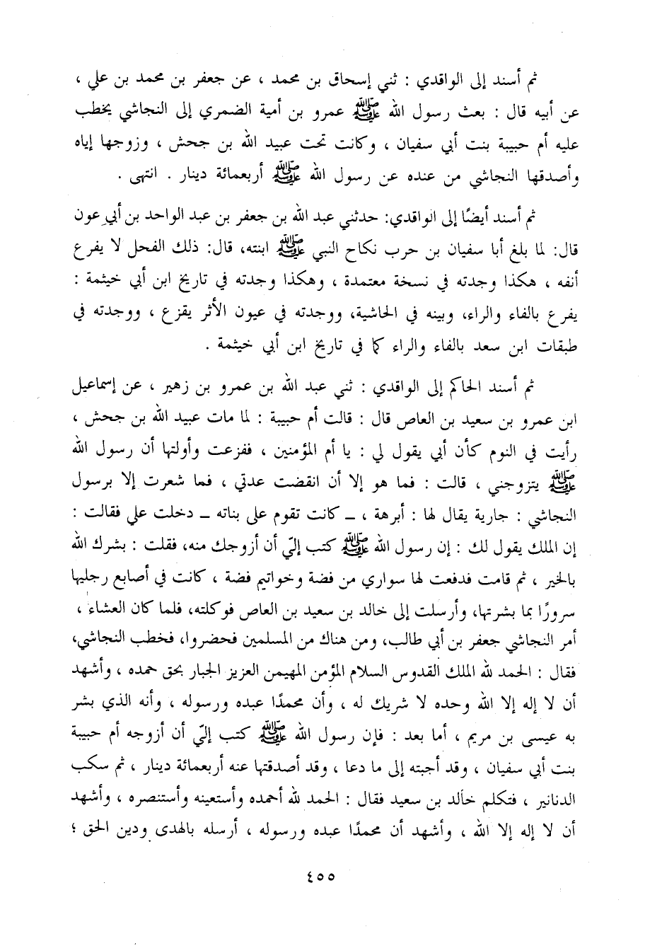 ثمَّ أسْند إِلَى الْوَاقِدِيّ ثني إِسْحَاق بن مُحَمَّد عَن جَعْفَر بن مُحَمَّد بن عَلّي عَن أَبِيه قَالَ بعث رَسُول الله صَلَّى اللَّهُ عَلَيْهِ وَسَلَّم َ عَمْرو بن أُميَّة الضمرِي إِلَى النَّجَاشِيّ يخْطب عَلَيْهِ أم حَبِيبَة بنت أبي سُفْيَان وَكَانَت تَحت عبيد الله بن جحش وَزوجهَا إِيَّاه وَأصْدقهَا النَّجَاشِيّ من عِنْده عَن رَسُول الله صَلَّى اللَّهُ عَلَيْهِ وَسَلَّم َ أَرْبَعمِائَة دِينَار