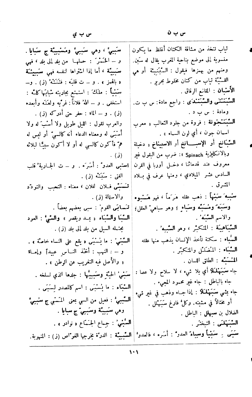 سبي, وهي سبي ومسبية ج سبايا. و- الخمر: حملها من بلد إلى بلد, فهي سبية, أما إذا اشتراها لنفسه فهي سبية "بالهمز". و- ت قبله: فتنته (ز). و- سبيًا: ملك: استمتع بجاريته شبابها كله: استخفى. و-الله فلانًا: غربه ولعنه وأبعده (ز).و- الماء: حفر حتى أدركه (ز). والعرب تقول: الليل طويل ولا أسب له ولا أسبى له ومعناه الدعاء أنه كالسبي أو ليس له هم فأكون كالسبي له أو لا أكون سبيًا لبلائه (ز).